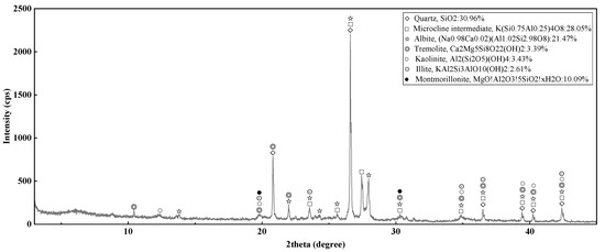 The core specimen, retrieved from a depth of approximately 1324.5 m in the Guantao Formation, is characterized by grayish-white coloration and composed primarily of fine- to medium-grained sandstone with minor coarse-grained gravel. The grains exhibit moderate sorting and subangular to subrounded morphology, while petrographic observations indicate significant intergranular porosity and weak siliceous cementation, reflecting good reservoir quality. To minimize the influence of sample heterogeneity and ensure representativeness, core samples used in injection experiments were selected from this narrow depth interval based on consistent visual appearance, sedimentary texture, and pore structure. This selection strategy ensured that the samples were typical of the target reservoir facies, providing a basis for evaluating fluid–rock interaction behavior. Cylindrical samples (Φ2.5 cm × L5–8 cm) were prepared for permeability testing, and geothermal fluids were obtained from the same formation used for injection experiments (Figure 3). All cylindrical sandstone core samples (Φ2.5 cm × L5–8 cm) were oven-dried at 60 °C to a constant weight and subsequently saturated with geothermal formation water through low-rate infiltration to simulate reservoir brine saturation and establish stable single-phase flow conditions throughout the injection experiments. Mineralogical composition was quantified via X-ray diffraction (XRD) through Rietveld refinement of diffraction orientations (2θ range: 3–45°) and intensity profiles. X-ray diffraction patterns and quantitative phase analysis are shown in Figure 4 and Table 1.