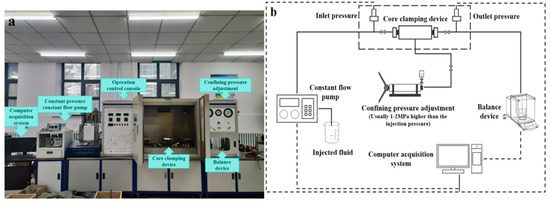 The instrument used in the dynamic core seepage experiment was a high-temperature and high-pressure core flooding apparatus (Origin: Huaxing Petroleum Instrument Co., Ltd., Nantong, China). The device and structure diagram are shown in Figure 5. This instrument can test the permeability of fractured core under a constraint pressure load and obtain the core permeability and other parameters. It is mainly composed of a constant pressure and constant-flow pump, intermediate container, core support, balance device, etc. The remaining experimental equipment includes an oil-free vacuum pump, filter membranes, and a digital thermostatic water bath used, respectively, for vacuum filtration of the injected fluid and precise temperature control to ensure consistent experimental conditions. In order to ensure the integrity of the core structure and avoid the risk of brittle fracture under the coupling effect of high pressure and high temperature for a long time, the short-period, high-precision observation mode is used to replace the traditional continuous loading scheme, breaking through the traditional continuous loading paradigm. Through finite-time, high-density monitoring (sampling interval of 15 s) combined with numerical extrapolation, the dual goals of risk aversion and full cycle behavior prediction are achieved.