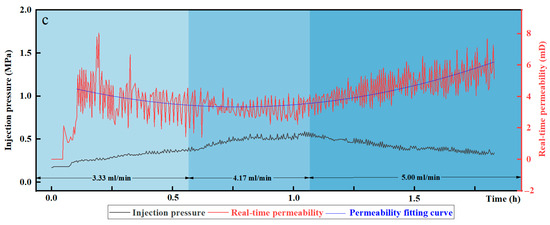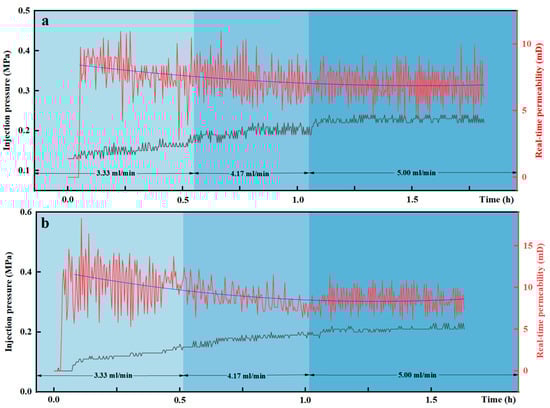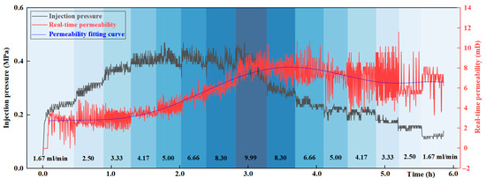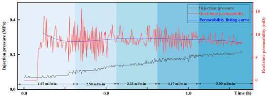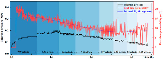 The experiment was initiated with the maximum flow rate, and then the flow rate was gradually reduced. The results showed that permeability showed a tendency to stabilize after being gradually reduced. When the flow rate was reduced to 5 mL/min, the permeability gradually stabilized, and when the flow rate was further reduced to 2.5 mL/min, the permeability slightly decreased; the injection pressure peaked at the end of 8.3 mL/min, and with the reduction in the flow rate, the pressure was also reduced step by step (Figure 7).