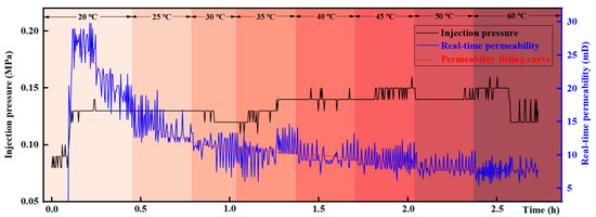 The results of the gradient flow injection showed that under the starting temperature of 20 °C, the initial injection was performed at a small flow rate (1.66 mL/min), and then the flow rate was gradually increased, the permeability increased significantly at the high-flow-rate stage (≥6.67 mL/min), and the corresponding inlet pressure increased significantly; when the flow rate was increased to the highest (9.99 mL/min), the permeability reached the maximum, and at the same time, the inlet pressure decreased significantly. Then, the inlet pressure decreased rapidly, and the permeability decreased during the subsequent stepwise reduction in the flow rate (Figure 6).