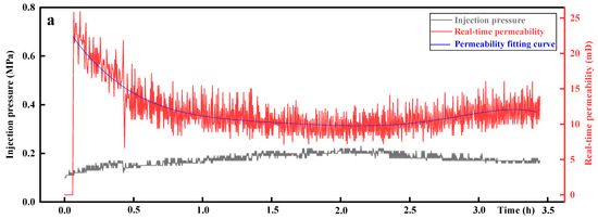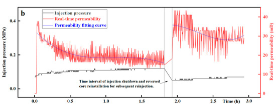 The results of the prolonged advantageous flow rate seepage experiments demonstrate that the core permeability declined over time to varying degrees. The rate of decline gradually decreased and eventually stabilized. Following the initial observation of slight permeability reduction, a reverse injection operation was conducted. This effectively removed potential particulate blockages, improved pore connectivity, and significantly enhanced permeability performance (Figure 12).