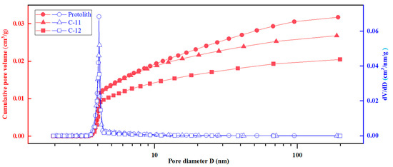 Pore structure characteristics of sandstone cores (C-11 and C-12) after long-term and reversed reinjection compared with the original protolith. Results indicate that both injection modes led to a reduction in total pore volume and specific surface area, with more pronounced losses observed in C-12. The sharp peak in dV/dD for the protolith suggests a well-developed mesoporous structure, which was significantly altered after fluid–rock interactions.