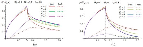 As shown in Figure 3, the differences between the graphs of and are more significant in cases with smaller Biot numbers. This means that the impact of successive waves becomes greater as the values of and decrease. Furthermore, by comparing the differences for a fixed time on the front and back surfaces, it can be seen that they are smaller on the front surface (the difference between the brown and purple continuous lines is smaller than that between the corresponding dashed lines), whereas the differences are smaller on the back surface (the difference between the dark yellow and purple continuous lines is greater than that between the corresponding dashed lines). In general, an odd number of lowest-order wavelets causes a smaller error on the front surface than on the back surface, whereas an even number of wavelets has the opposite effect. This can be explained by the fact that even order waves propagate toward the rear surface, and truncation of even-order and higher-order waves consequently has a stronger effect on the front surface than on the rear surface. Similarly, odd-order waves propagate toward the front surface, which results in their greatest impact on the rear surface.
