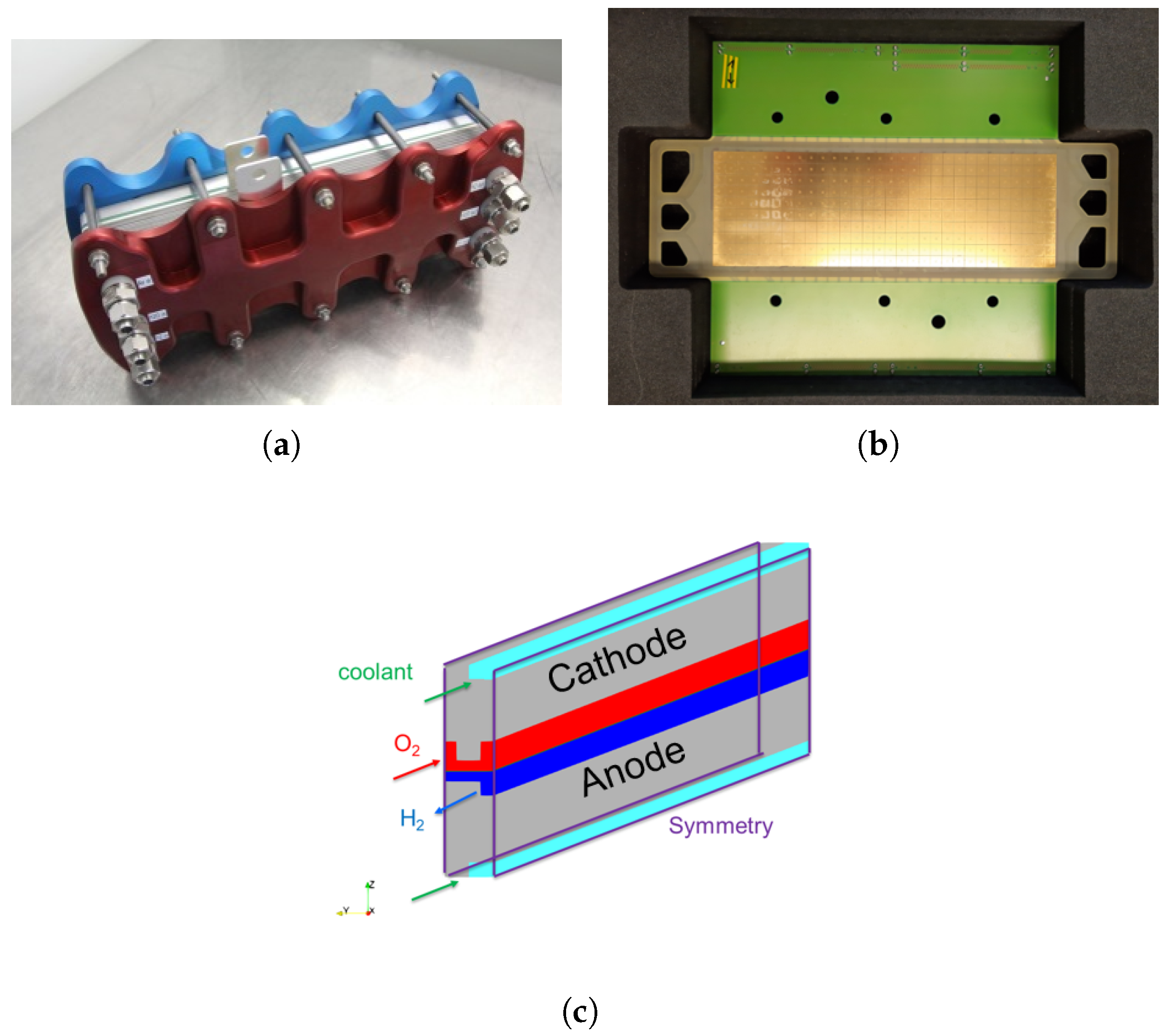 45]. This toolbox was developed to simulate electrochemical devices, such as fuel cells and electrolysis cells. The electrochemical modelling is more advanced than the model by Weber et al. It involves modelling the electronic and proton transport through the relevant parts of the fuel cell. Furthermore, the well-known Springer model is employed to describe water transport through the membrane, while liquid water transport is modelled in porous structures and gas channels. However, the model does not explicitly include a coolant flow field, which directly impacts the thermal management of the fuel cell. An extension of the PEM fuel cell model of openFuelCell2 is described by Bulgarini et al. [