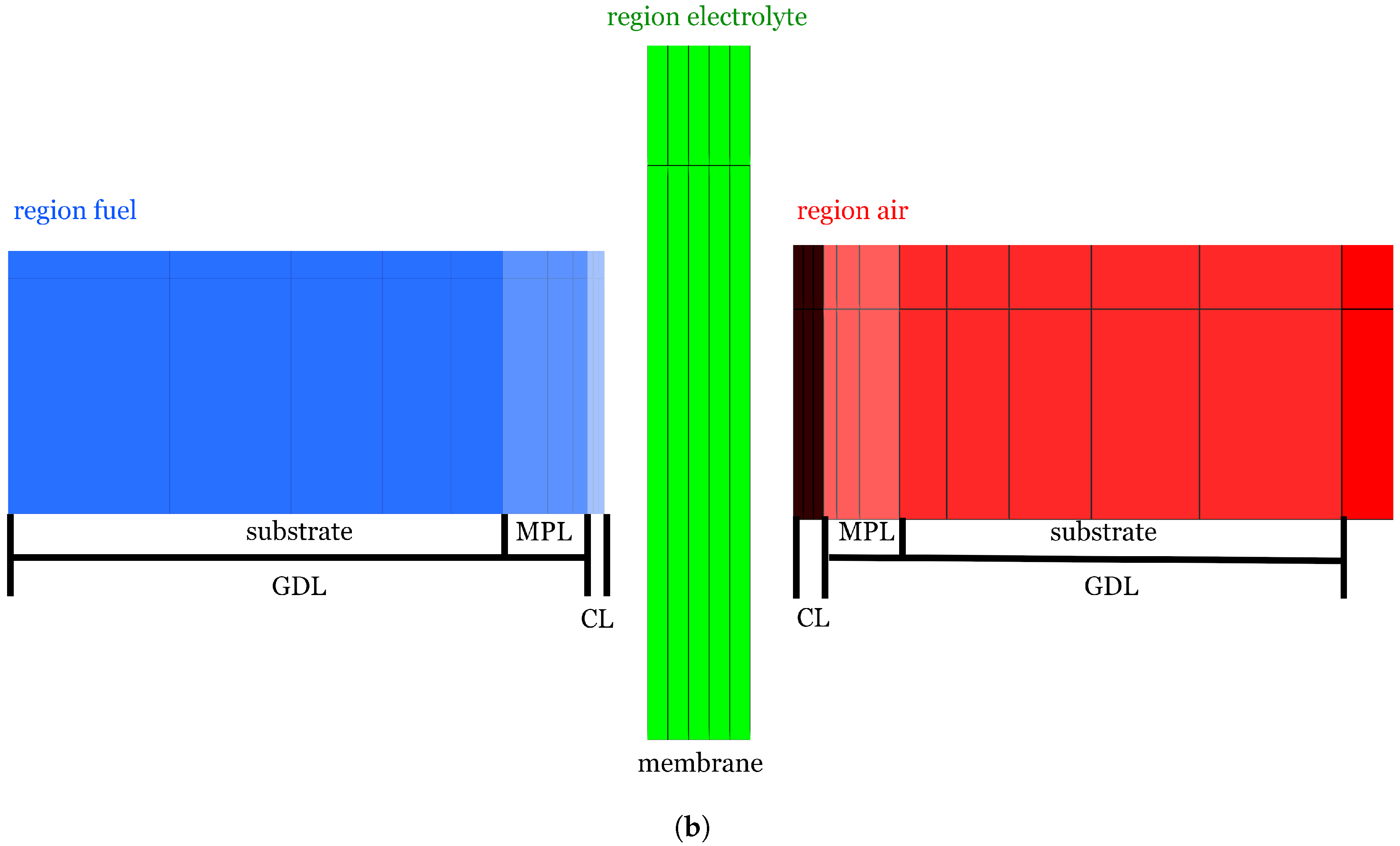 43]. The model of Weber et al. describes the electrochemistry by an activation overpotential using a two-dimensional Tafel equation, which is applied only to the cathode side. Liquid water transport in porous media is also considered. The authors of the present paper conducted some simulation tests on this model to evaluate its usability. Unfortunately, the model showed inconsistencies in the mass balance; so, it was not analysed further. In 2023, an improved version of the openFuelCell project was published as openFuelCell2 [