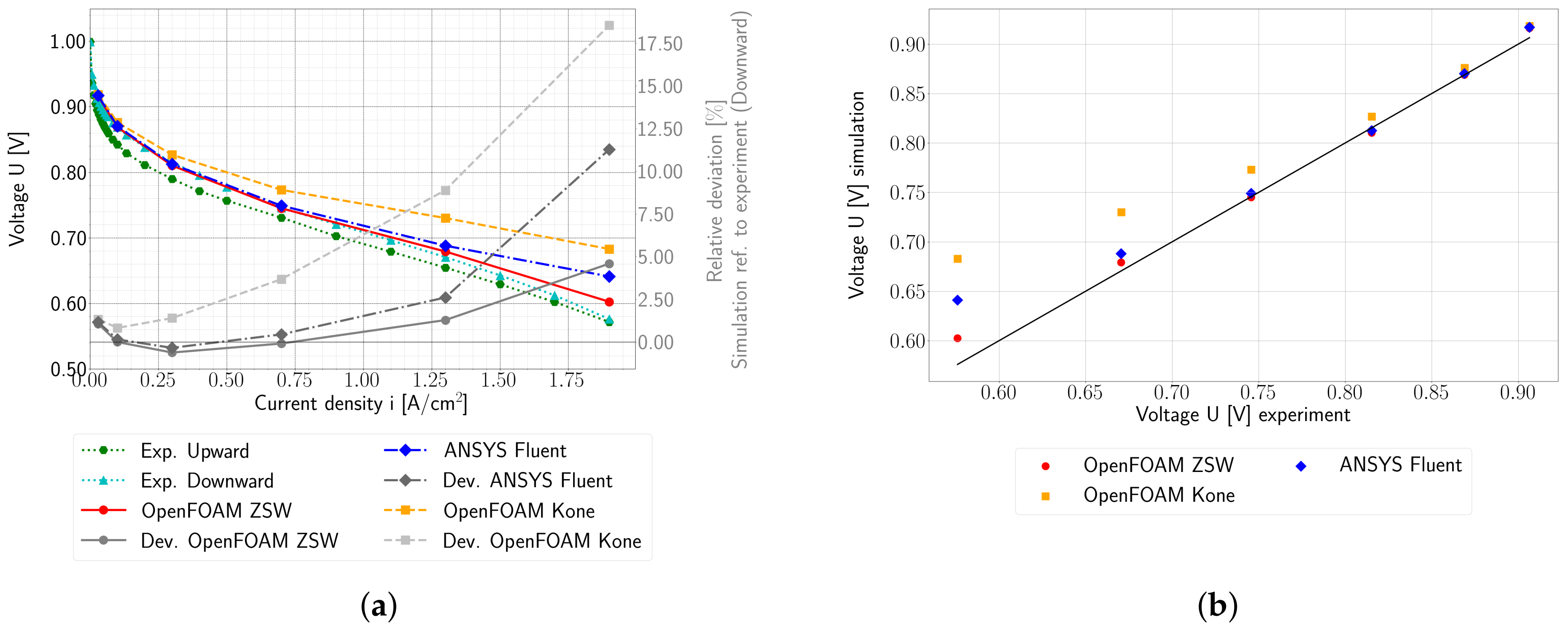 Section 1). Furthermore, the significant influence of the liquid phase effects on the operation of fuel cells is undeniable. However, the present model aims to combine advanced numerically stable electrochemical modelling of PEM fuel cells with an open-source approach. The aim of this work was to strike a balance between sophisticated modelling and the availability of an open-source code base, while ensuring numerical stability, in order to create a practical and usable performance model for the open-source CFD code OpenFOAM. Nevertheless, the implementation of several more advanced models, such as a 3D representation of the membrane and two-phase modelling, is pending, and the current model does not account for the effect of ageing. Furthermore, the predictability of current density in particular requires further attention. A comparison with the openFuelCell2 model [