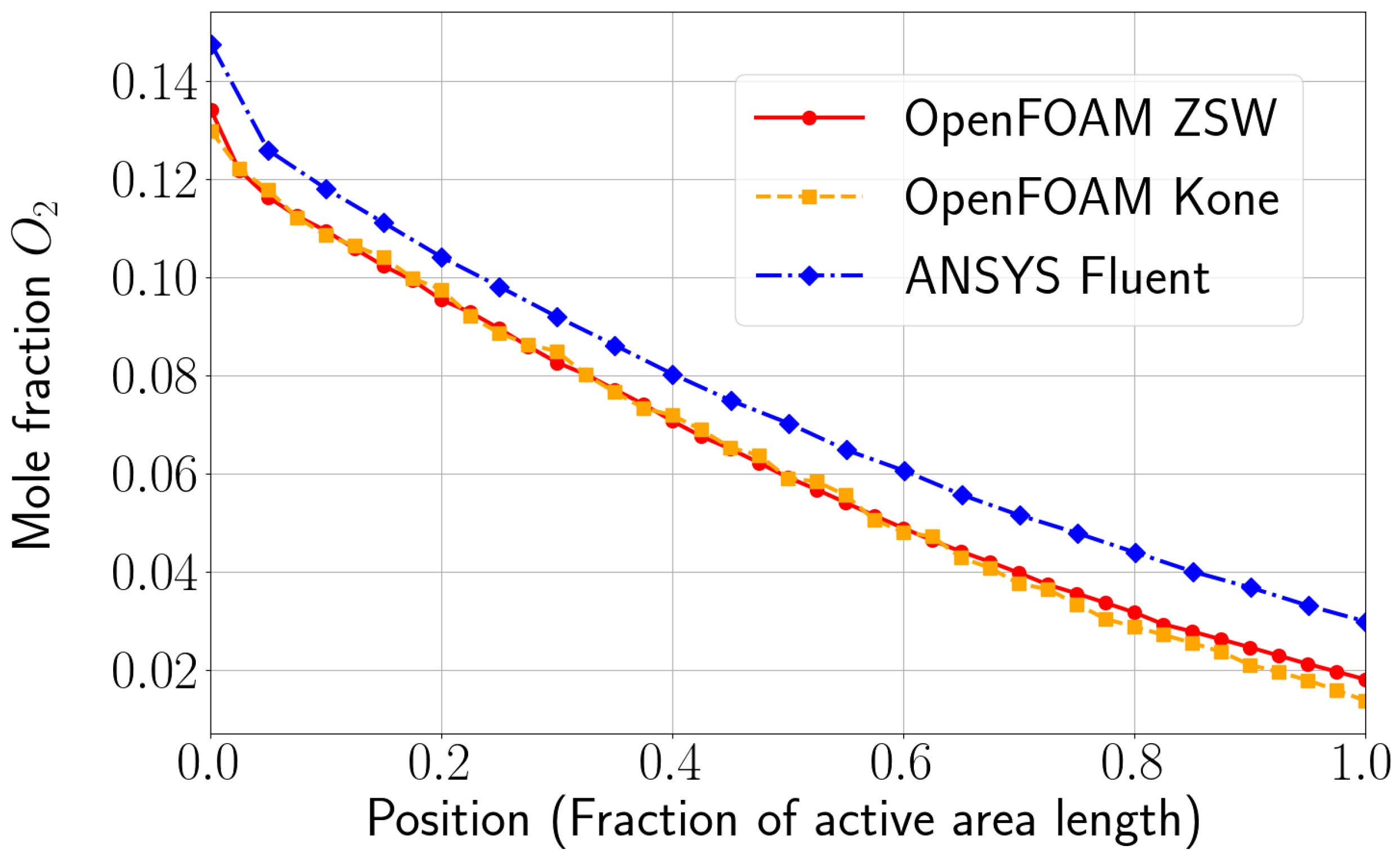 48]. Compared with the OpenFuellCell2 model, the electrochemical model by Kone et al. is simpler, as it does not explicitly consider the water transport through the membrane. Thus, each of the aforementioned OpenFOAM models has its respective advantages. However, in their present state, none of them completely fulfill the requirements for modelling the relevant physics and chemical reactions of fuel cells and managing numerical stability.