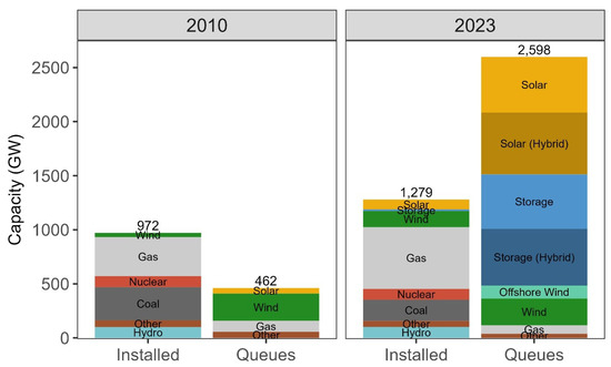 Installed generation capacity and queued interconnection requests in the United States in 2010 and 2023, by technology type. While total installed capacity increased modestly, the volume and composition of queued projects shifted dramatically, with solar, storage, and hybrid configurations dominating recent interconnection requests. Source: [2].