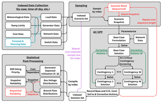 The methodology assumes access to an AC OPF solver and focuses on the supporting data structures, scenario design, and workflow organization needed for probabilistic analysis in an interconnection study context. The process consists of four key components: