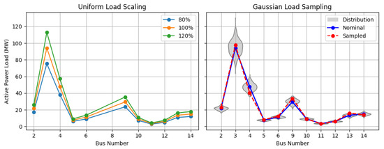 Scenario sampling is a central computational technique for solving optimization problems under uncertainty in power systems. In CC-OPF, sampling can inform the formulation in multiple ways, for example, by embedding realizations as sample-indexed constraints via sample-averaged surrogates [23] or by estimating uncertainty margins that parameterize a deterministic reformulation [25]. Within S-OPF, scenarios can be embedded directly into the formulation, for example, as per-scenario AC-feasible constraints with iterative scenario selection [26], multi-stage scenario trees with non-anticipativity [27], and dynamic AC OPF solved across forecasted wind scenarios [29]. More generally, [28] addresses stochastic dispatch with scenario-driven uncertainty. In robust and security-constrained settings, “samples” can be interpreted as elements of the contingency set. Classical SC-OPF enumerates base and post-contingency cases and improves tractability via relaxations or constraint screening [30,31]. Data-driven robust variants bring sampling into the formulation by drawing realizations to build uncertainty sets that the OPF must satisfy for all points, for example rectangular or polyhedral sets calibrated via scenario approach guarantees [21]. These contingencies and sampled uncertainty sets define structured scenario families that are solved per case and then aggregated for analysis.
