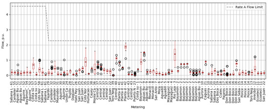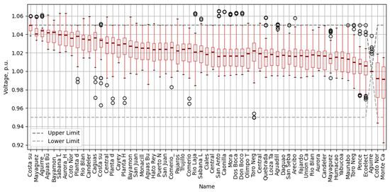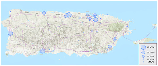 Figure 13 presents the average reactive power contributions from DERs across all base and contingency cases in the final retirement stage. These outcomes reveal several system-level insights. As legacy thermal units retire, the analysis highlights specific areas where additional distributed reactive compensation becomes necessary for optimal dispatch. Much of this demand aligns with large load centers and industrial zones, consistent with significant inductive demand. When reactive injections coincide with active dispatch, hybrid PV–battery sites emerge as particularly valuable since they can manage both active and reactive power flexibly. In contrast, for PV-only facilities, developers may need to oversize nameplate capacity or install dedicated shunt banks, which is common practice at utility-scale plants. Finally, in locations where reactive power is dispatched without active output, the findings suggest a role for stand-alone compensation devices, either new shunt capacitors or conversion of retired synchronous machines into condensers. In Puerto Rico, this appears especially relevant around the San Juan metropolitan area.
