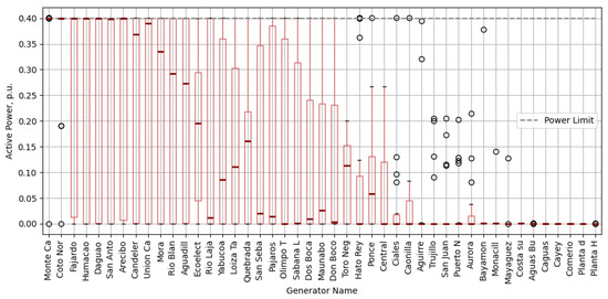 Figure 11 shows active power dispatch statistics for each candidate DER site under the final retirement stage. In [38], we present results for all four retirement stages and observe increased DER dispatch as legacy generation is retired, peaking in the final stage shown here. Because dispatch levels vary systematically across retirement stages, we compile dispatch statistics per stage rather than over all stages simultaneously.
