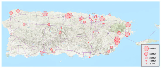 Geospatial view of expected DER utilization (MW) across all scenarios in the final retirement stage, centered on node locations in the public BPS model. Marker size reflects higher expected MW dispatch; clusters indicate high utilization density. The analysis highlights Humacao as the highest-density region, followed by Vega Alta, with San Juan exhibiting many smaller sites, consistent with rooftop PV patterns. These insights indicate where solicitations (RFPs) may yield the most impact.
