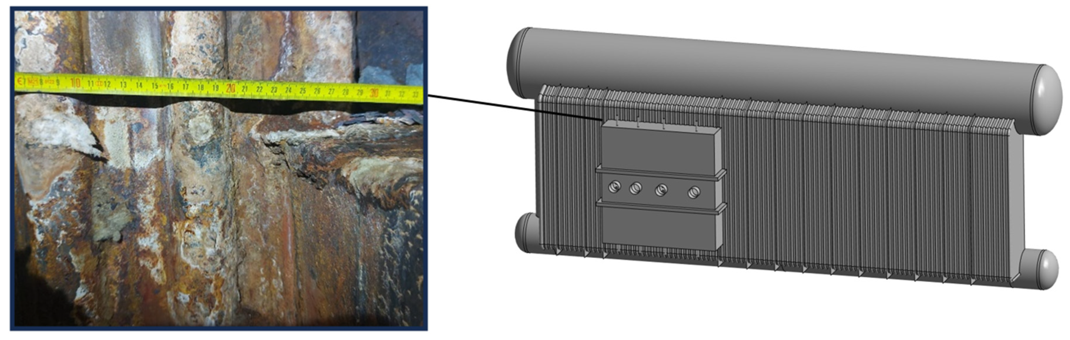 Figure 2. These tubes operate under a medium pressure of 5 MPa and a temperature of 371 °C. The damage manifests as water leakage at the rupture point, which, due to prolonged seepage, also leads to external corrosion of the pipes and the accumulation of deposits on their surface, as illustrated in