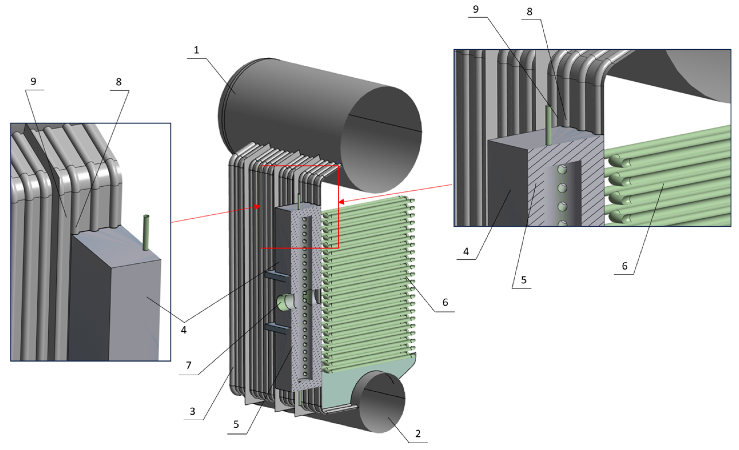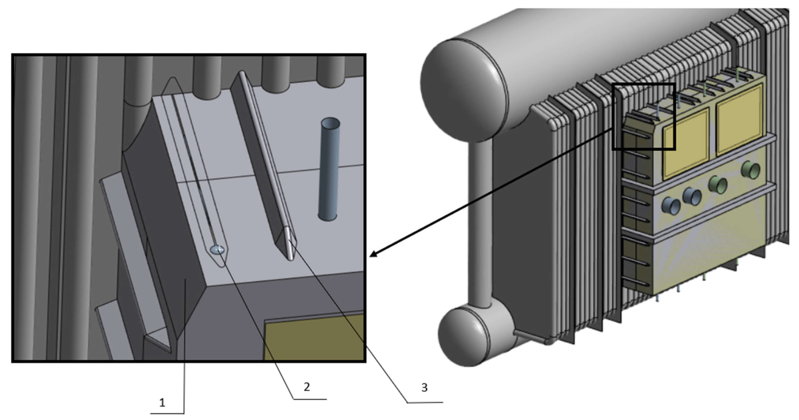 Figure 3 shows a section of the boiler where the failure occurred. The box marked 4 is welded to the wall of the combustion chamber number 3. This box is designed to accommodate the installation of superheater coil number 6, along with chambers and connectors number 7 in the boiler. Thermal insulation is installed on the outside of the drums marked 1 and 2 and the walls marked 3. The box itself is not insulated from the outside. The box is made of heat-resistant or carbon steel; therefore, considering the direct impact of flue gases on the box, it must be protected from overheating from the inside so that its temperature remains comparable to that of the wall to which it is attached. For this purpose, wool marked 5 is used in the box, which should be tightly packed. Unfortunately, this wool often degrades over time and does not provide sufficient insulation against flue gases, frequently leading to localized overheating, as shown in