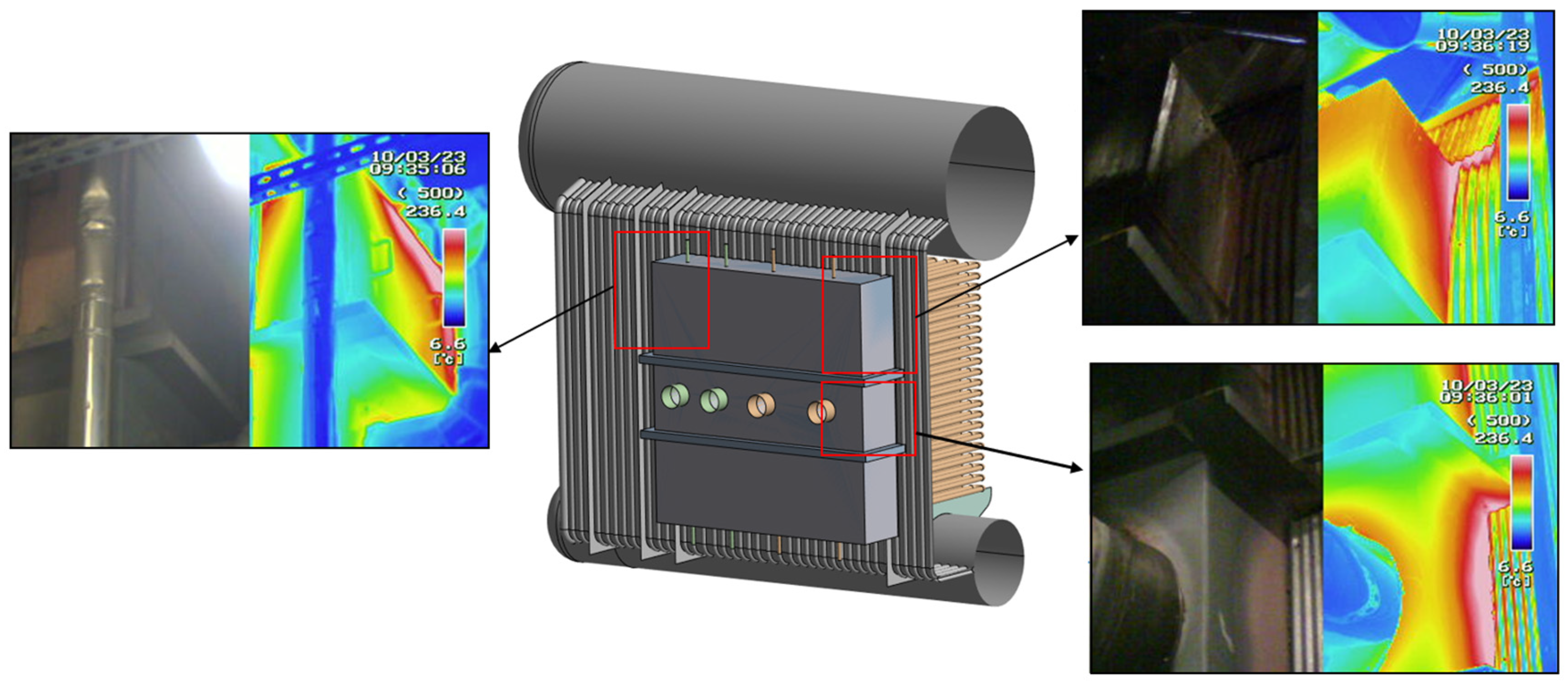Figure 7. The thermal analysis is conducted at steady state because the goal is to determine a representative, long-term temperature distribution under nominal operating conditions. The boiler operates predominantly in a steady-state regime, and the infrared thermography measurements are carried out under these conditions. The results of the thermal analysis are presented in