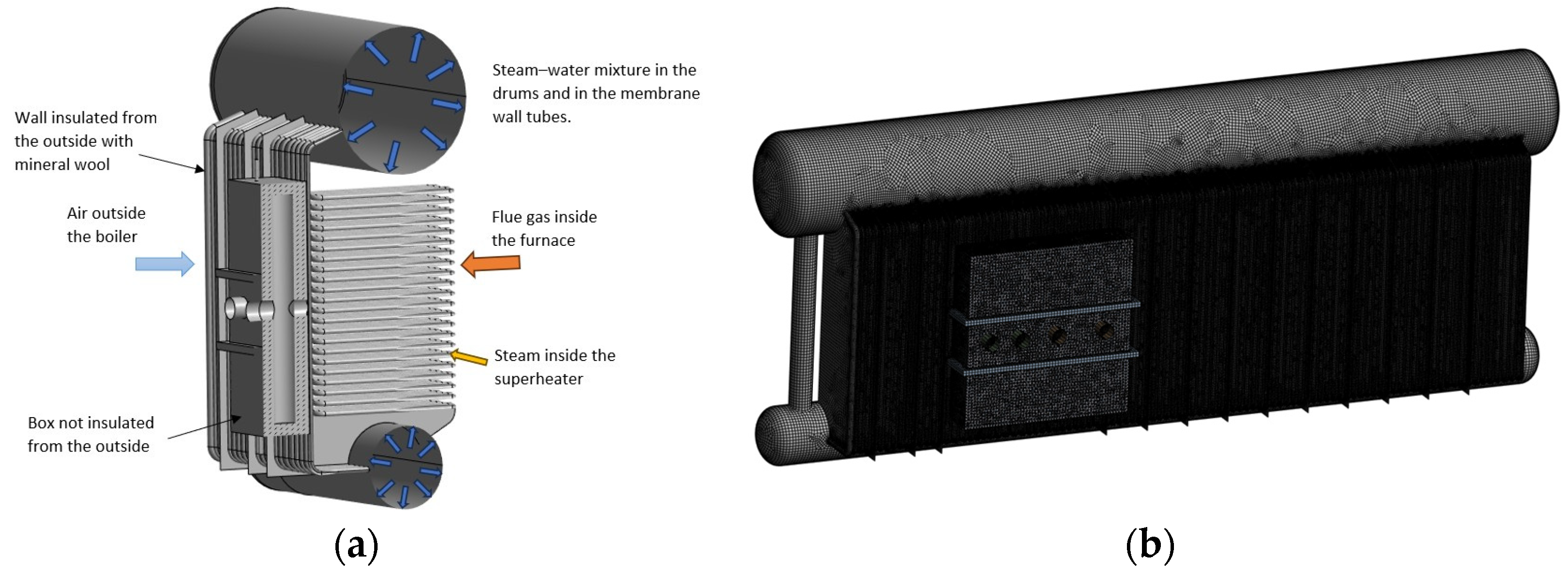 2 °C, respectively. These values are confirmed by the boiler designers and checked during the boiler start-up phase before its operation. Since the boiler walls and drums are insulated externally with mineral wool, except for the outer surface of the box, the analysis assumes zero heat exchange with the environment in these areas. However, the box is exposed to the ambient air, so heat exchange with the environment occurs there. The air-side heat transfer coefficient is assumed to be 4.27 W/m