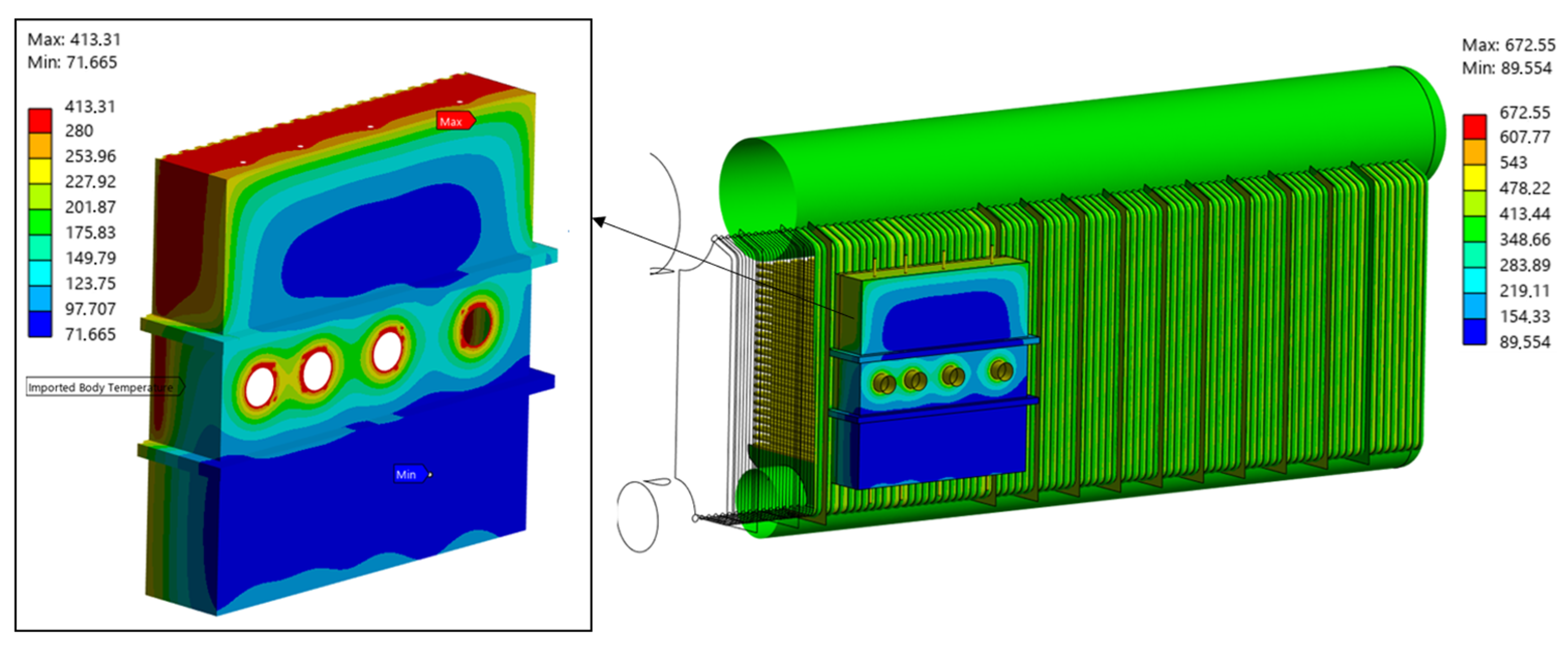 The obtained temperature distribution results are used in the FEM analysis to assess the stress distribution in the box, fins, and membrane wall tubes. A one-way coupling between thermal and structural analysis is assumed. Structural calculations are based on a force equilibrium, a geometric, and a constitutive equation: