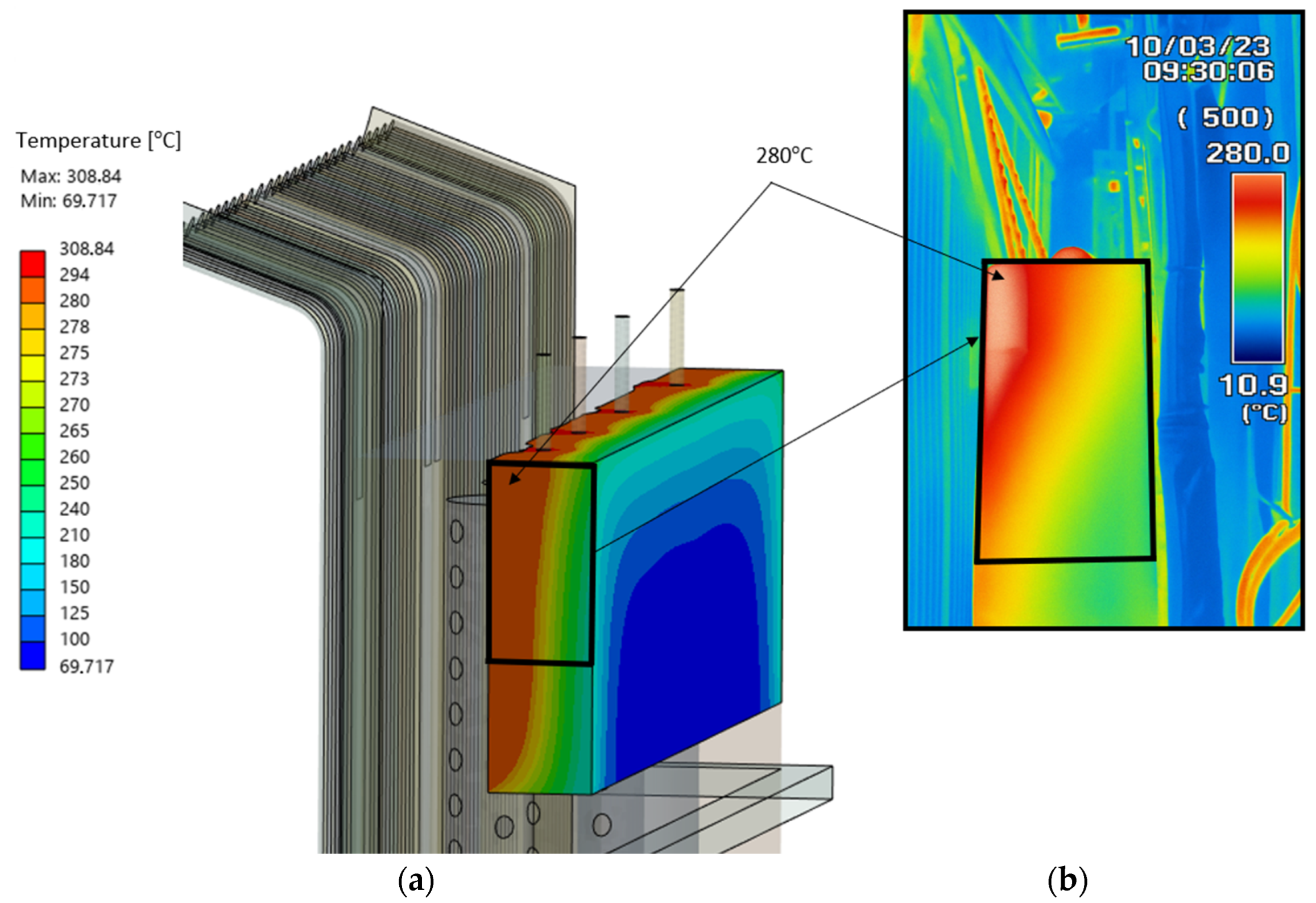 Figure 9. For comparison with thermography, the numerical results are limited to 280 °C, i.e., at the value equal to the maximum temperature recorded in the IR image at the cut-off line on the box, where the membrane wall insulation begins. The comparison is performed using an image-based quantitative method, where pixel values from both FEA and IR thermography are converted into temperature fields and evaluated point-by-point [