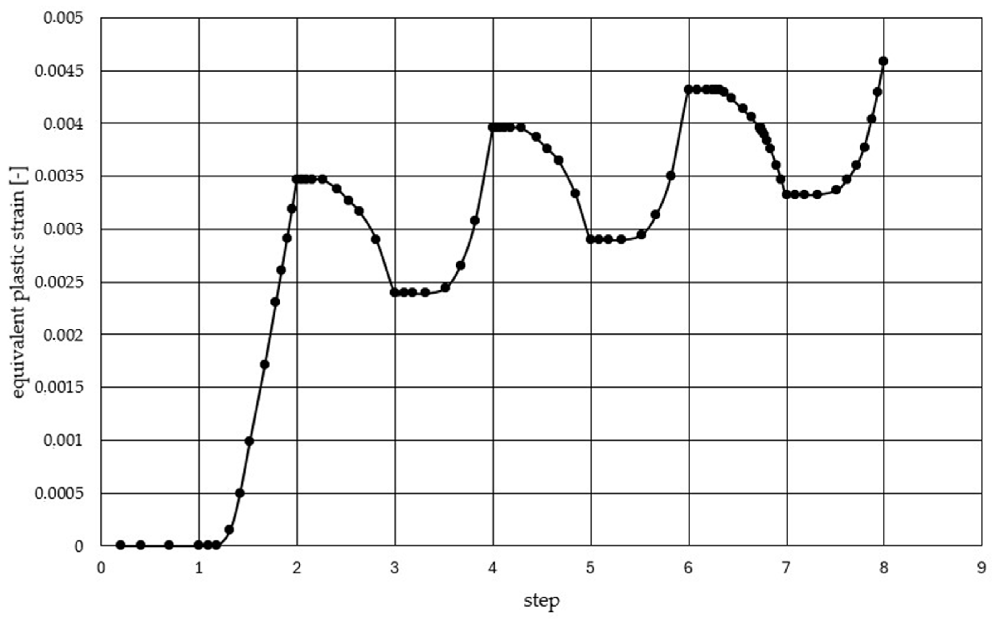 Figure 11). The results of the analysis accounting for the cyclic operation of the boiler indicate a continuous increase in plastic strain, which leads to the occurrence of ratcheting [
