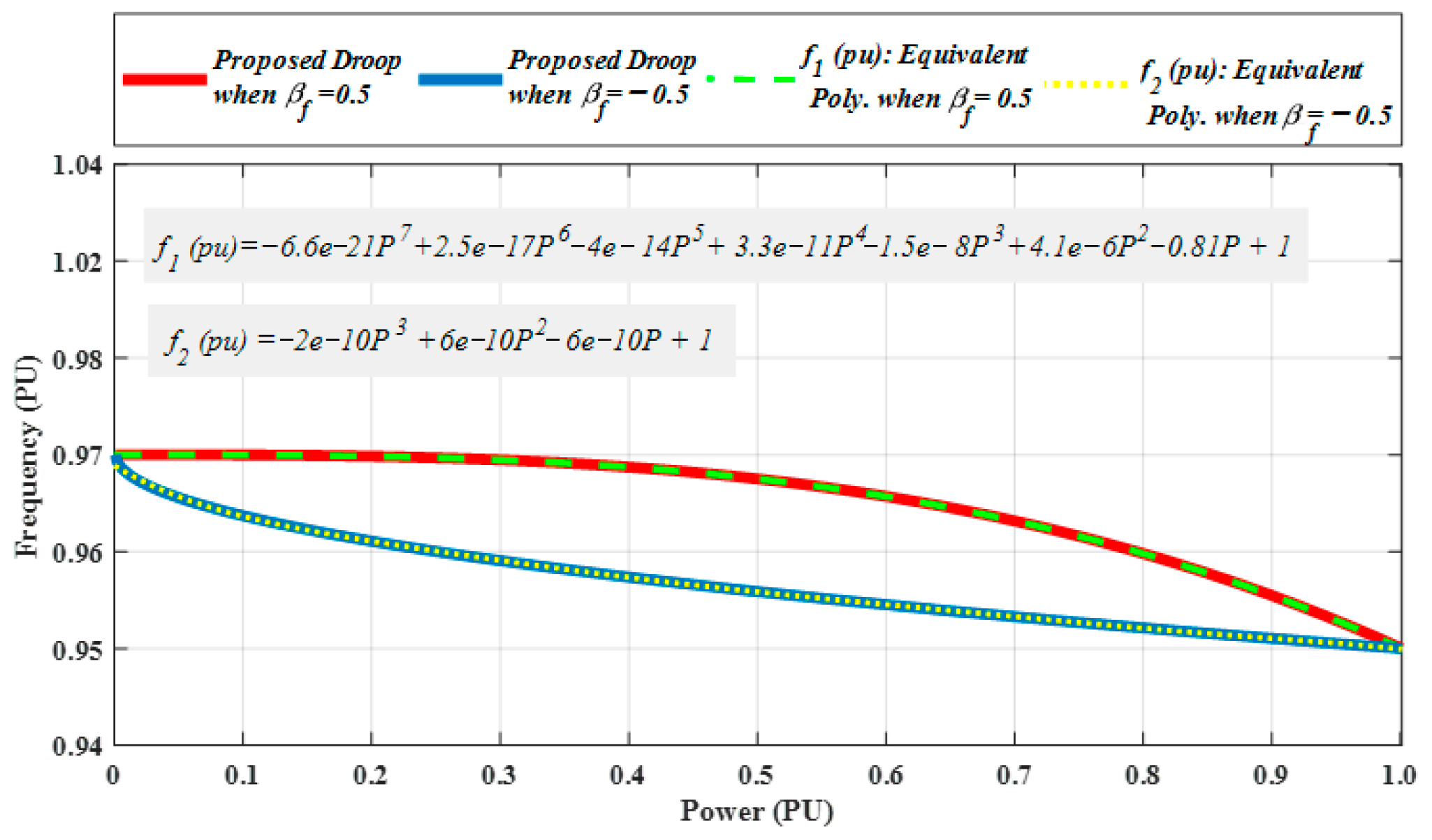 - By changing the exponent droop coefficient (i.e., ) (considering as a “variable” with a predetermined fixed ), the relation can be flexibly shaped. The obtained relation is equivalent to a high-order polynomial that requires several terms to construct. An example is given in Figure 3 where the droop relation is reconstructed using a 3rd order polynomial (equivalent to ) and 7th order polynomial (equivalent to ).