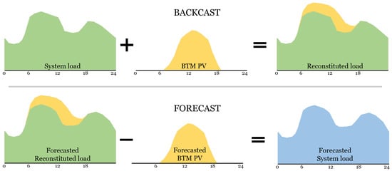The reconstituted load method has been demonstrated in a prior study [23] to improve forecasting performance in power systems with integrated PV generation. This approach reconstructs the underlying load by adding PV generation to the observed system load, thereby reducing distortions introduced by PV variability. The forecasting model first predicts the reconstituted load and subsequently subtracts the estimated PV generation to obtain the final system load. In this study, the reconstituted load method is applied to forecast system load in a large-scale power system with PV integration. The procedure of the reconstituted load method is illustrated in Figure 1.