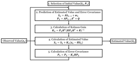 where denotes the Kalman gain, which serves as the weighting factor in the Kalman filter algorithm. is the observation matrix that defines the relationship between the measurements and the state vector. represents the covariance matrix of the measurement noise vector (), which typically originates from sensor inaccuracies. The final corrected state estimate () is obtained by adjusting the predicted state () using the Kalman gain () and the measurement residual . The overall flowchart of the Kalman filter algorithm is illustrated in Figure 2.