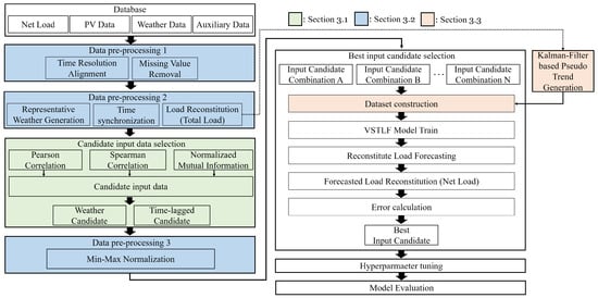 In the proposed method, the reconstituted load is first computed by combining the system load with PV generation data, thereby properly accounting for the influence of PV generation. Input candidates are then selected through multiple correlation analyses—the Pearson correlation coefficient, Spearman correlation coefficient, and NMI—applied to both weather variables and time-lagged features. To enrich the temporal characteristics of the input sequence, pseudo-trend components are generated using a Kalman filter-based predictor and incorporated into the input. The model forecasts the reconstituted load using combinations of selected input candidates and the pseudo-trend data. The forecasted loads are then converted back to system load, and the input combination that yields the lowest forecasting error is selected. Finally, hyperparameter tuning and model evaluation are performed.
