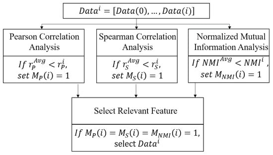 In this study, candidate input features are selected through an integrated correlation analysis framework that prioritizes variables consistently exhibiting strong associations with the target load. The selection process combines the Pearson correlation coefficient to assess linear relationships, the Spearman correlation coefficient to capture monotonic trends, and the NMI to quantify the mutual information shared between variables. The overall process of input feature selection is depicted in Figure 5.