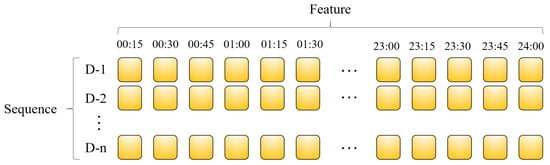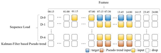 Additionally, to provide the model with forward-looking information specific to the forecast date, a pseudo-trend is generated using a Kalman filter-based predictor and incorporated into the input sequence. This pseudo-trend is obtained using the method proposed by Jung et al. [5], which is designed to capture the underlying load dynamics by identifying both recent and historical trend components. The resulting trend sequence represents the temporal direction of the forecast day’s load profile. The sequence-feature structure of the input data is illustrated in Figure 6.