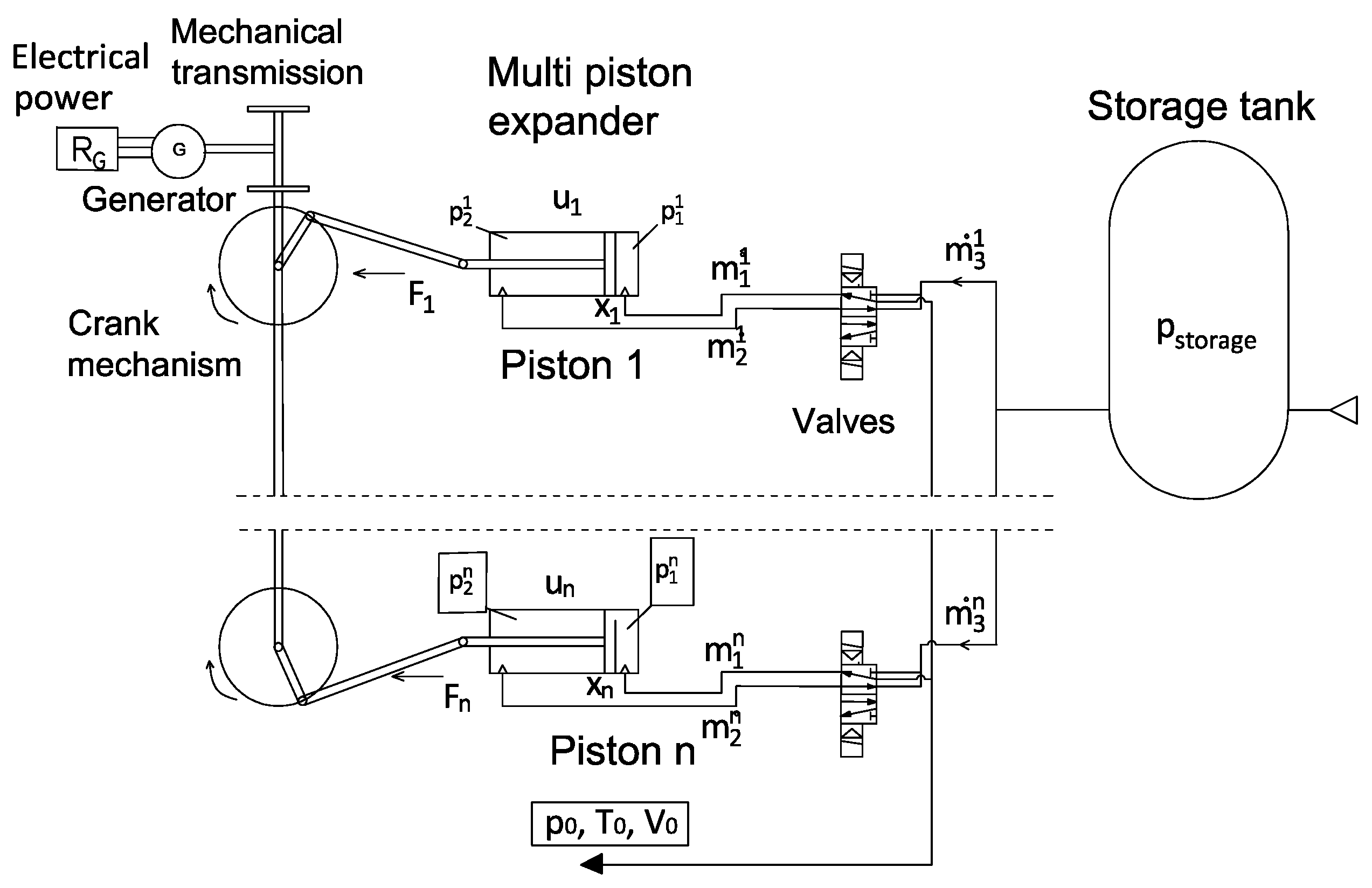 The topology of the m-CAES system with a multi-piston expander is illustrated in