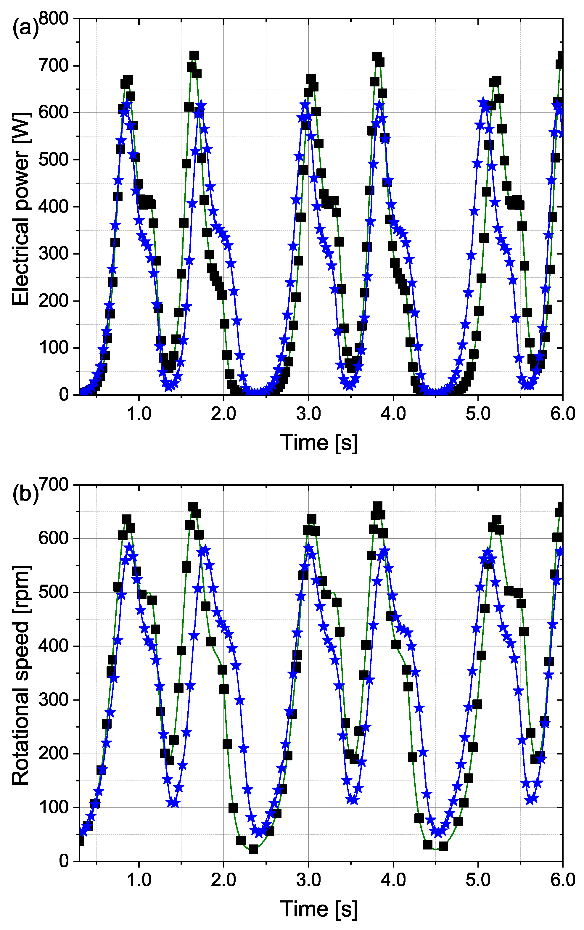 Applying a PWM of 0.1 at such a low supply pressure value allowed the expander to fully utilize the energy of air expansion. However, it can be observed that the pistons, by driving each other, also created a suction effect in the cylinder, which is visible in the pressure plot as a vacuum condition. The piston moved the full length of the stroke, reaching a maximum linear velocity of 1.2 m/s. The generated electrical power stabilized after approximately 10 s of expander operation at a level of 320 W, with a rotational speed of 380 rpm.