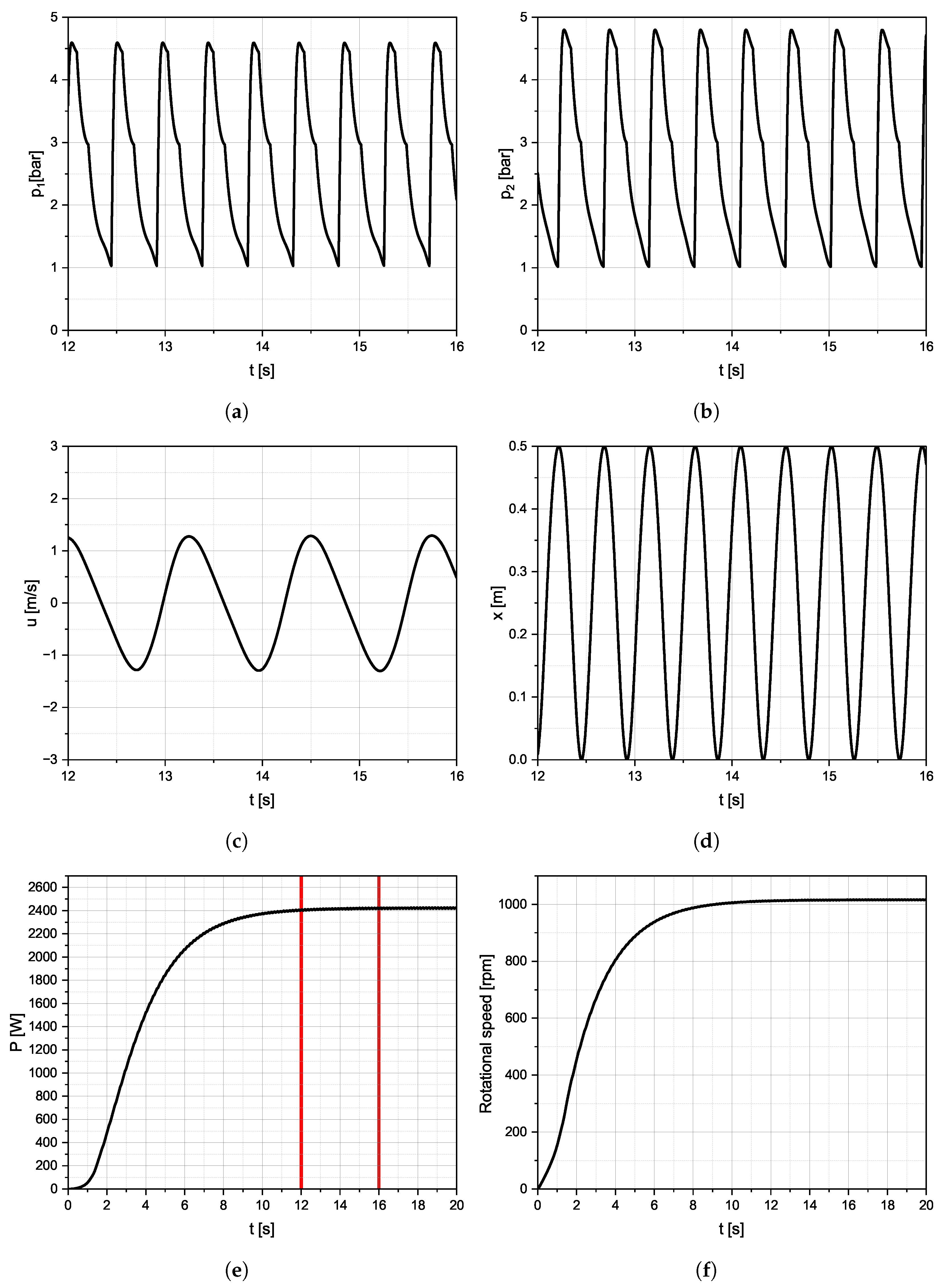 Simulation results for the piston expander system at DVC 1 and PWM = 0.9: (a) pressure in the retract chamber, (b) pressure in the extract chamber, (c) piston linear velocity, (d) piston displacement, (e) generated electrical power, (f) rotational speed of the shaft.
