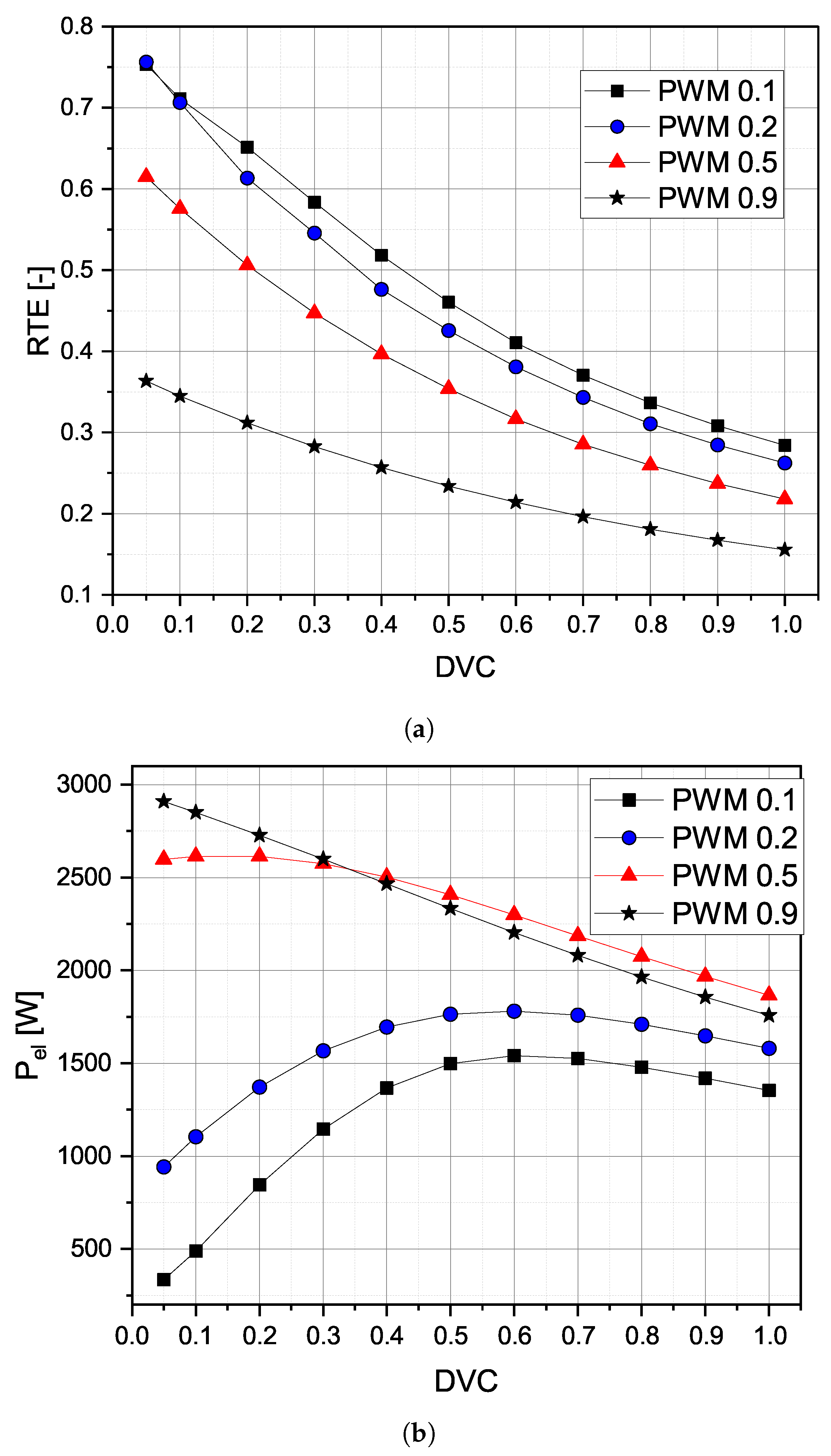 Figure 6a,b illustrate the effect of the DVC on RTE and electrical output power (