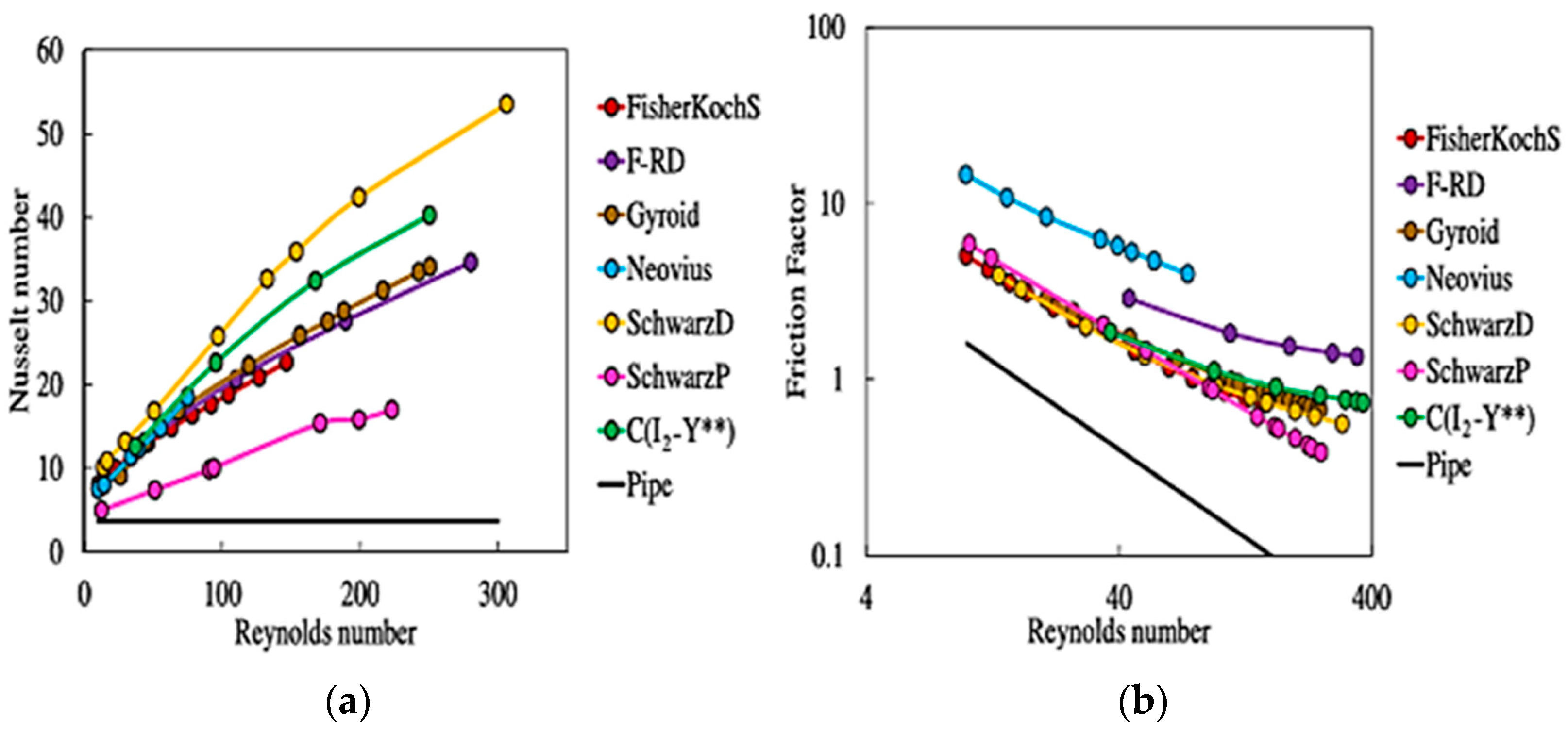 - Passos, A.G.P. Laminar Flow and Heat Transfer in Triply Periodic Minimal Surfaces. Master’s Thesis, Lund University, Lund, Sweden, 2019. [Google Scholar]