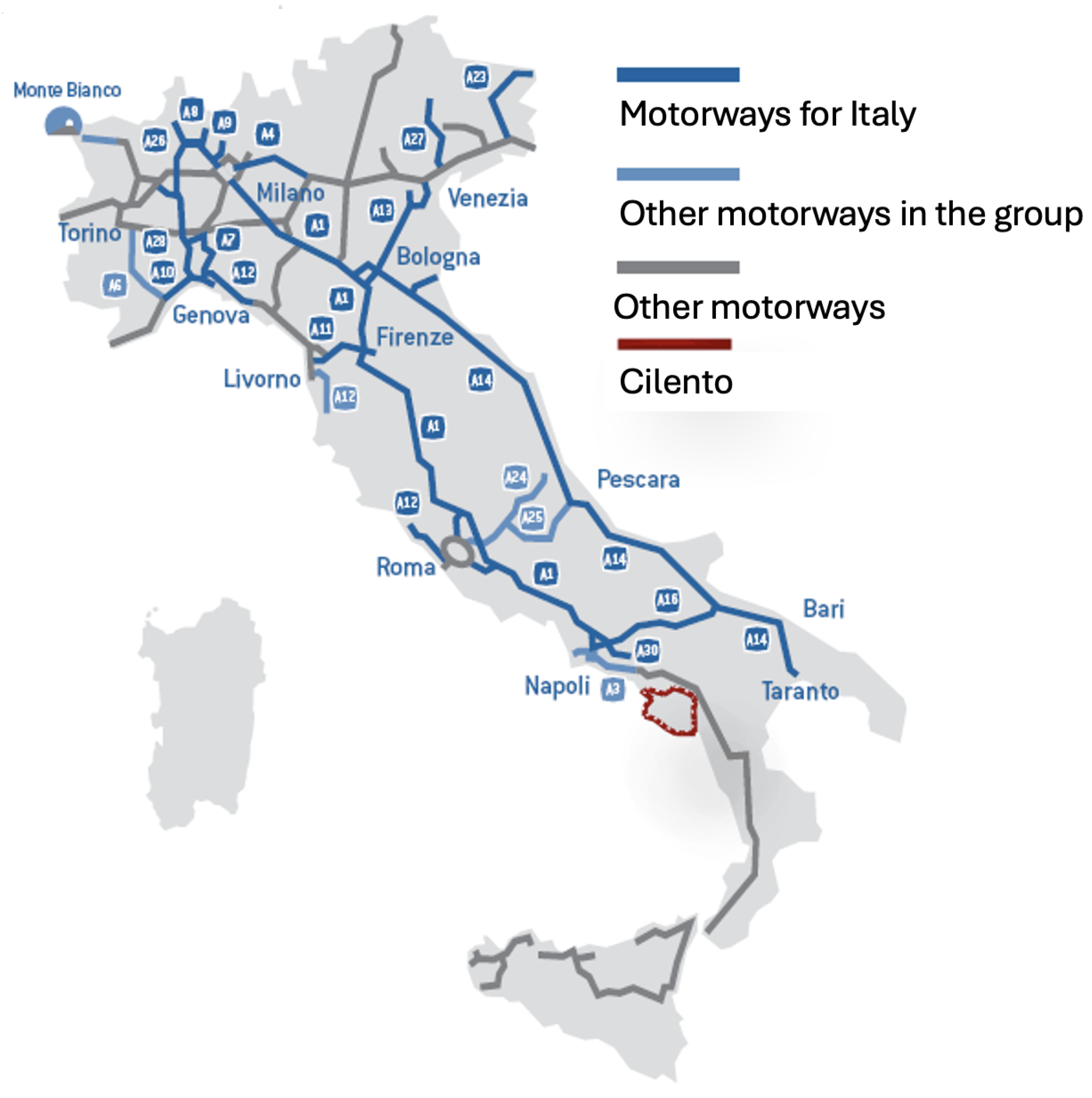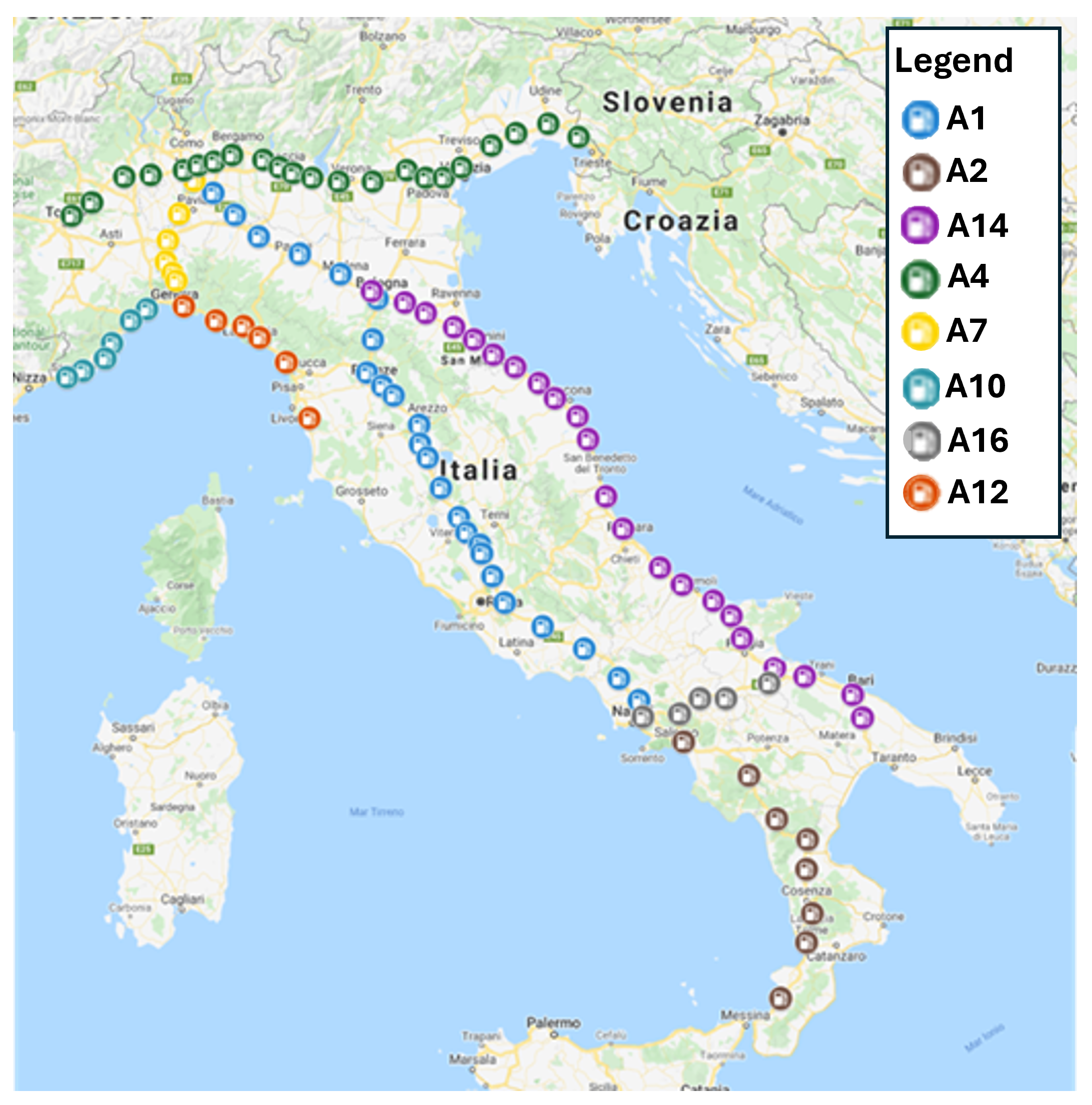 | A1 (Milano–Napoli) | A2 (Salerno–Reggio) | A14 (Bologna–Taranto) | A4 (Torino–Trieste) |