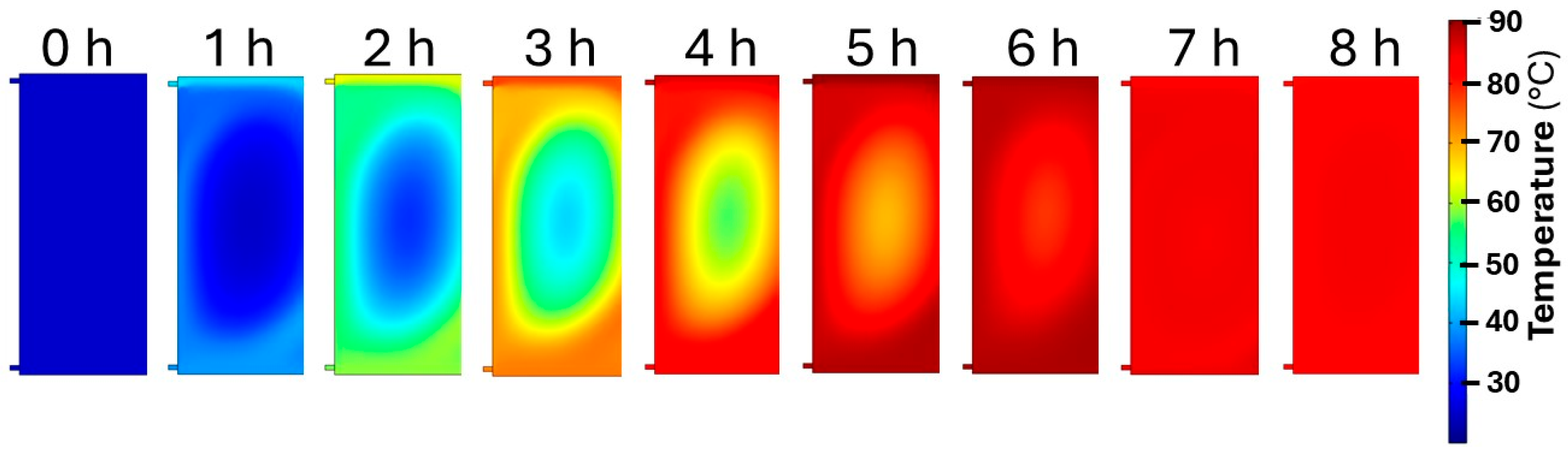 3.1. Base Case: Operation of the Solar Collector Network–Storage System Without Water Recirculation (SCN-TES Without Recirculation)