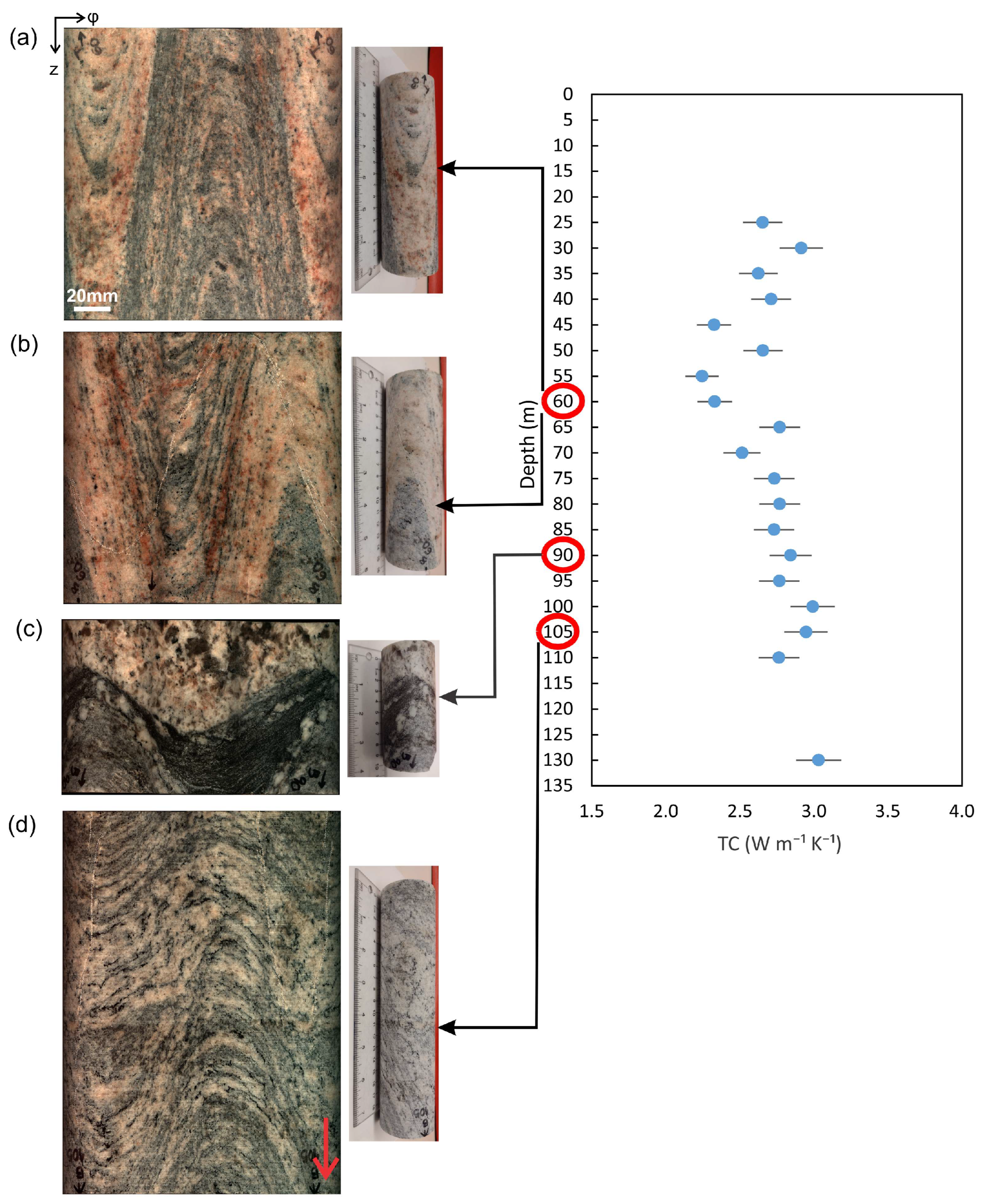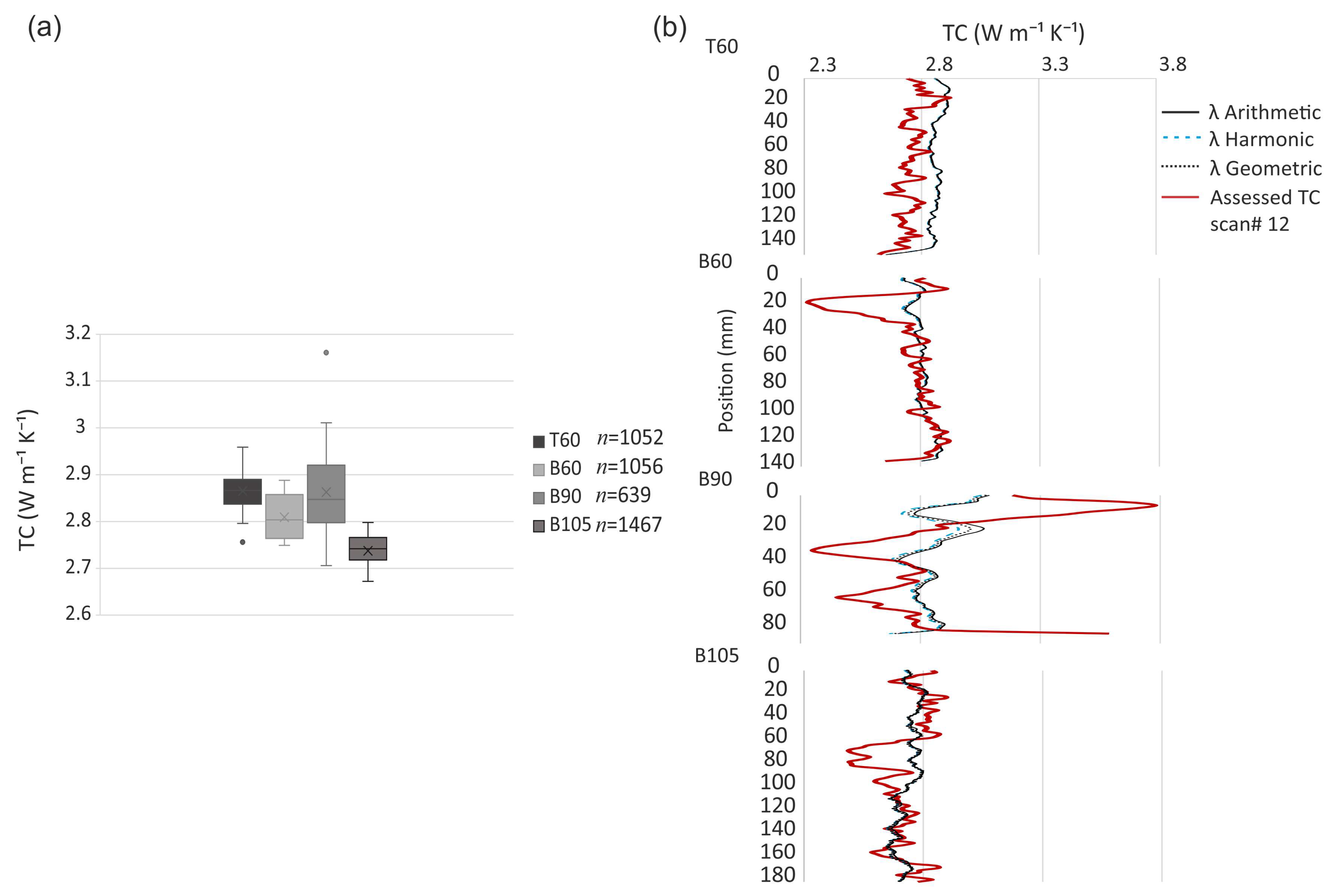- TC profiles assessed with the TCS are comparable to the one calculated with numerical simulation results, although the latter is smoother, particularly where the fluctuations are of low amplitude, and the amplitudes are reduced at the highly heterogeneous sections, for example, from length Z = 5 to 45 mm in sample B90 or Z = 28 to 180 mm in sample B105. This is because the TC assessed at a point with the millimeter scale can be different from that calculated for a section at the centimeter scale involving heat transfer over a greater distance.