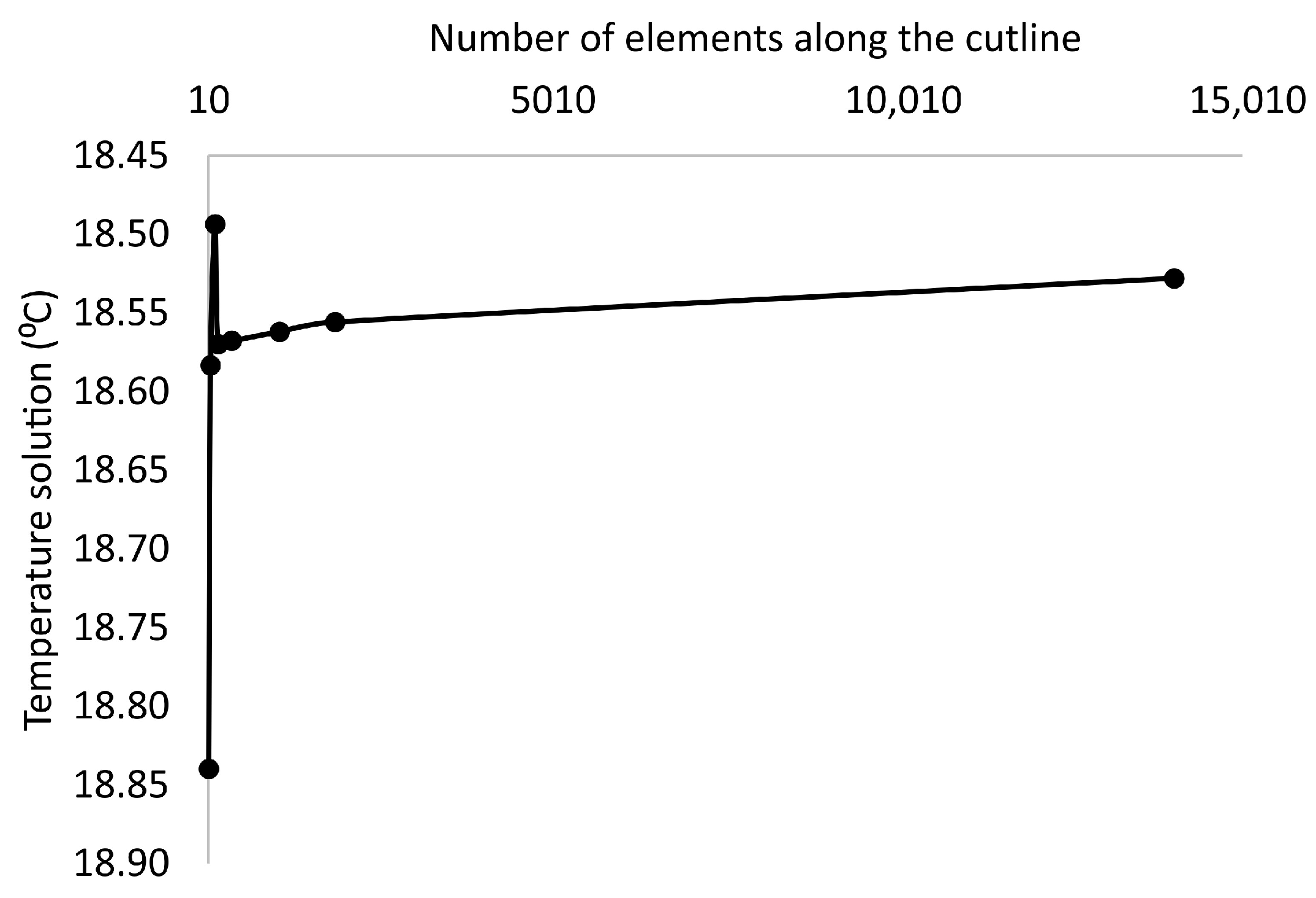 - On Figure 12b, at the position 70–80 mm, the TC values overlap, which indicates that the scale has no effect on effective TC calculation, i.e., the calculated effective TC from numerical simulation results is the same, whatever the length of the section. It is because that section is located at a symmetrically opposed TC variation. Thus, by expanding the section length, the addition of more TC values on one side is always compensated by the new values included on the opposite side, so that the average value does not vary.