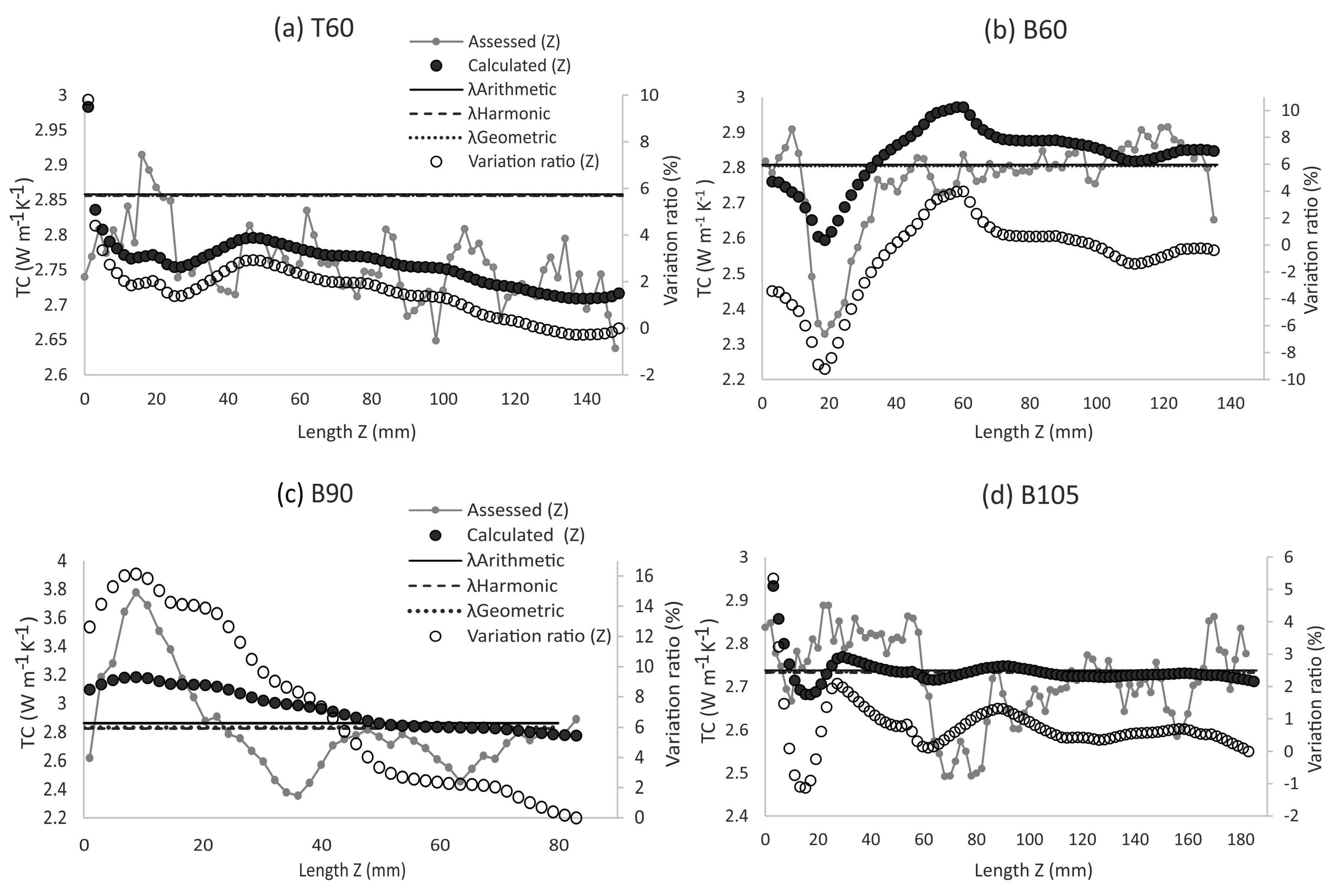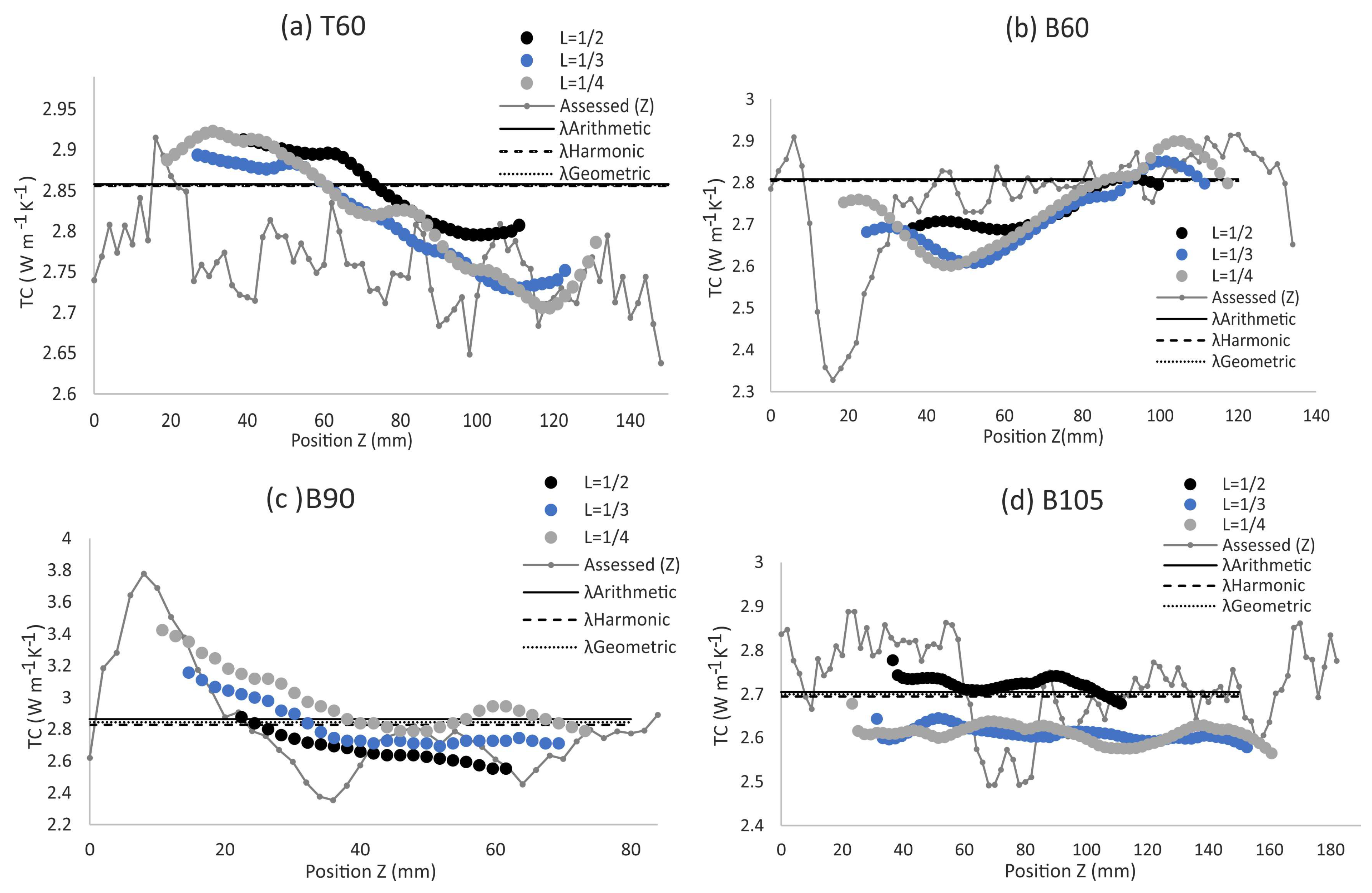 - The shorter the section, the more the effective TC is over- or underestimated, depending on the heterogeneity of the section. The variation ratio varies with the section length. For the four studied samples, it varied from −10% to +16%, in relation to the TC value calculated for the entire length of the sample.When the section length is randomly moved along Z direction, the result shows the following: