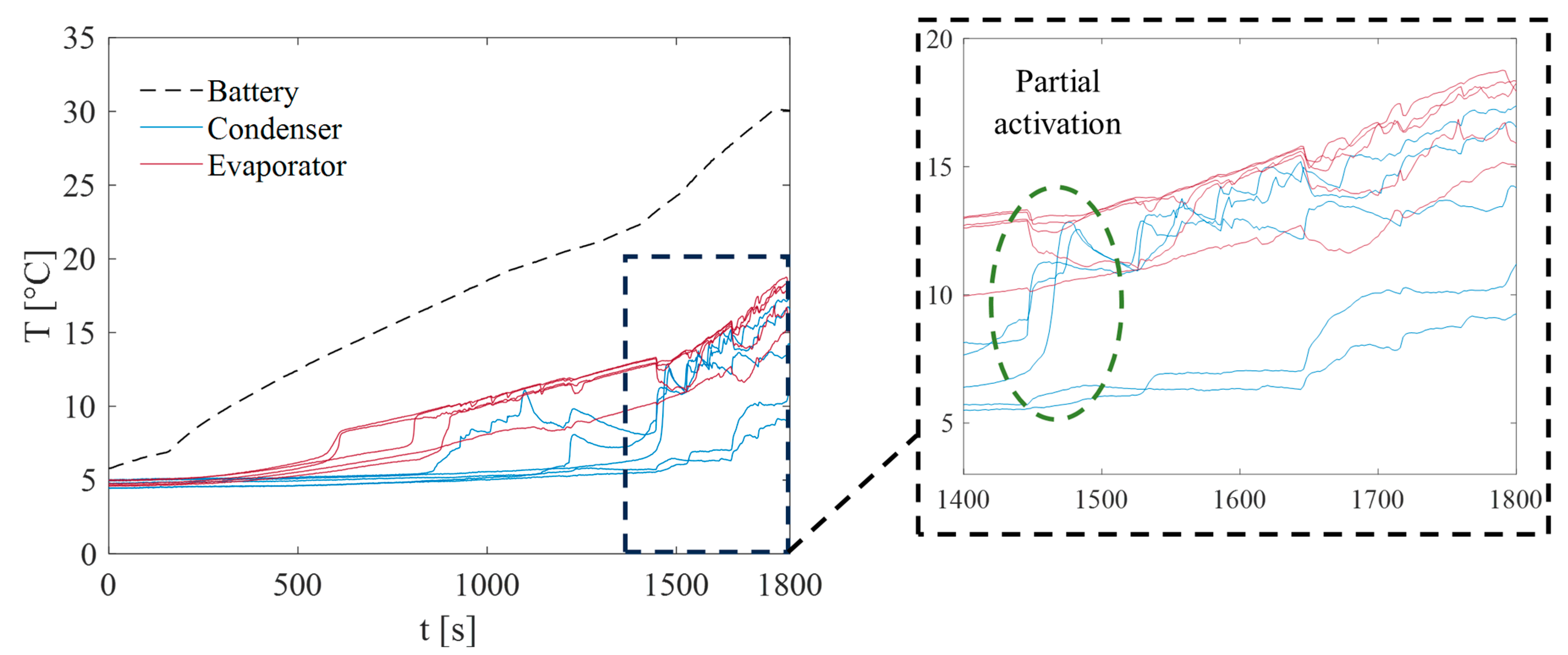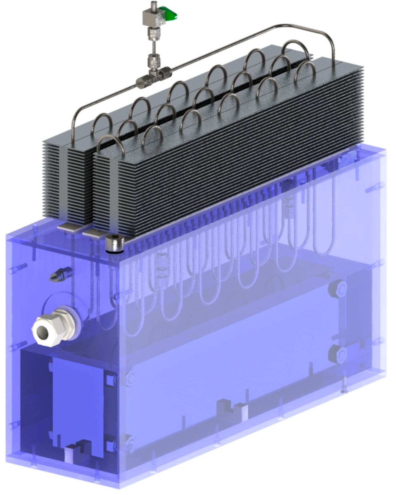 - Hybridization for extreme conditions: In the engineering phase of product development, active elements can be incorporated into the condenser section of the PHP. This hybrid approach would extend the applicability of the system to rare but extreme high-temperature scenarios. Since such conditions are expected to occur only occasionally and for limited durations, the required active components would remain simplified and significantly downsized compared to conventional cooling systems.