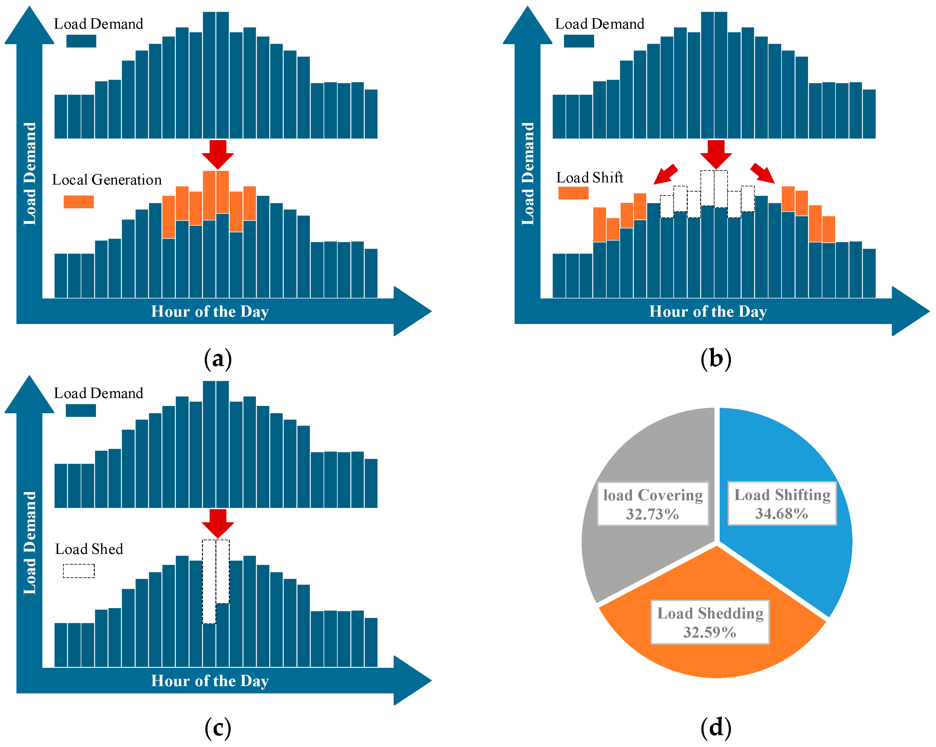 - Load shifting: This strategy refers to the use of flexible resources such as energy storage and shiftable loads to achieve peak shaving and valley filling of the load profile of buildings, as shown in Figure 3b. The implementation of this strategy is commonly guided by electricity price signals or incentive mechanisms, which realizes 4 to 6 h of power mitigation.