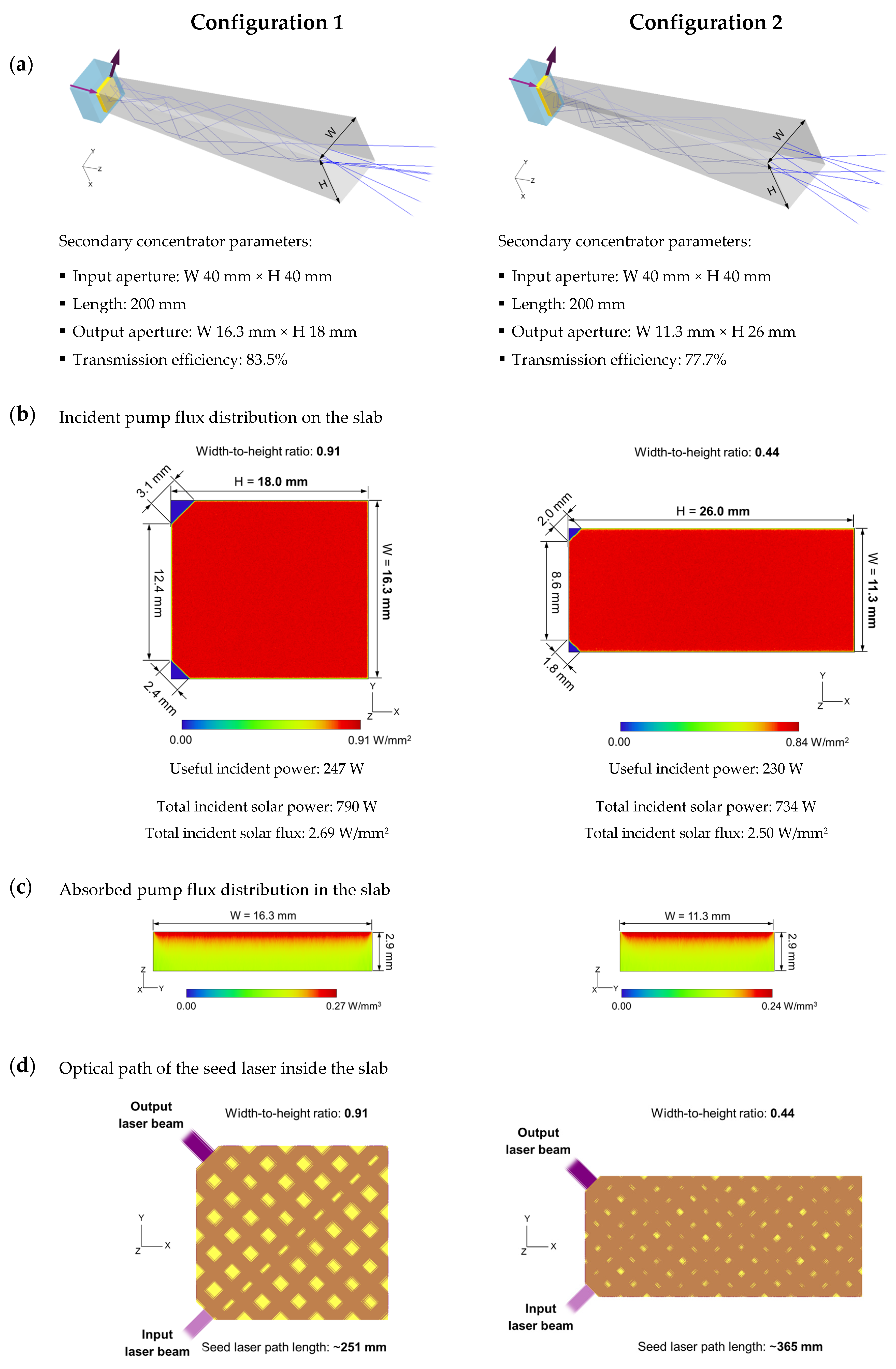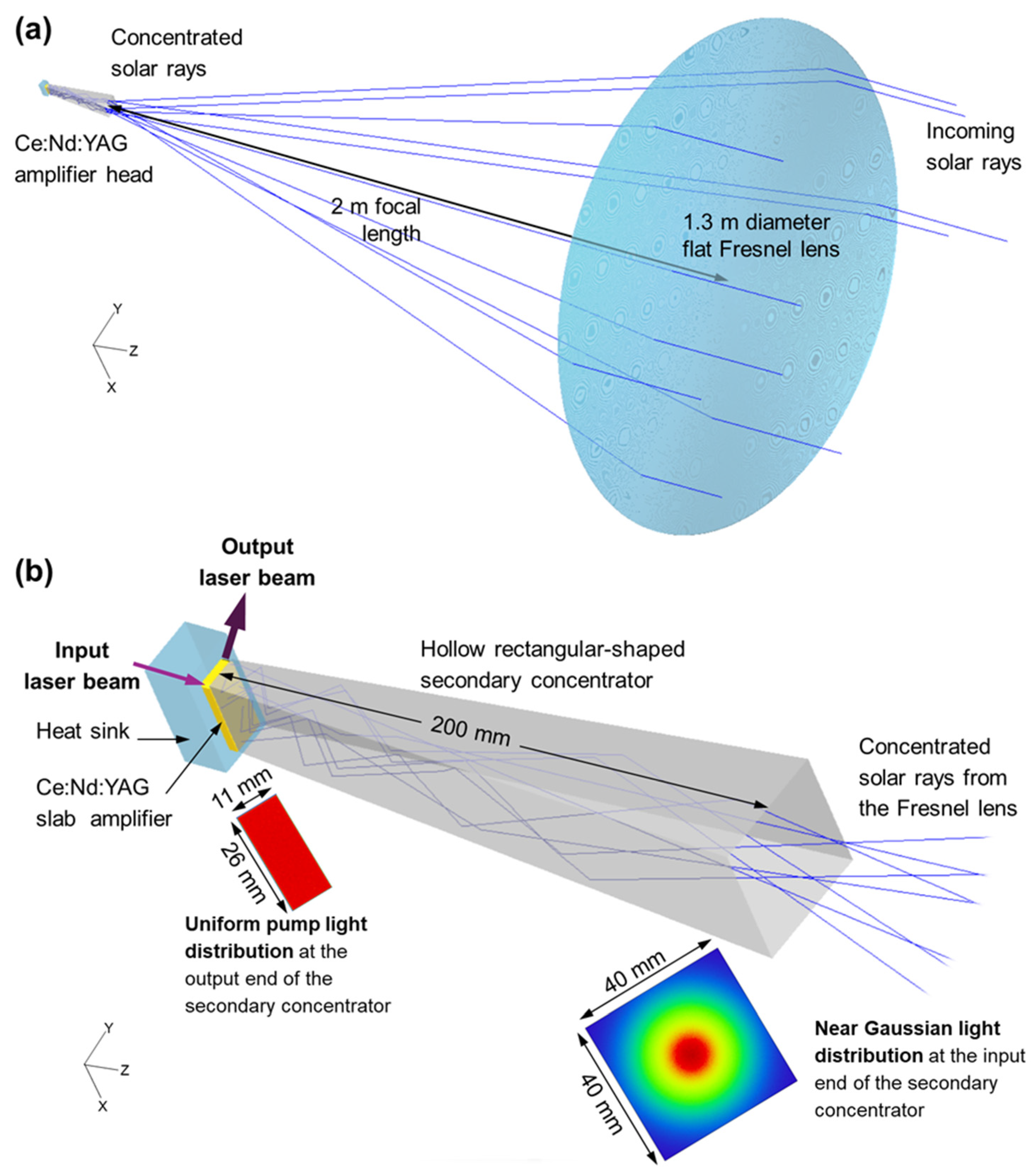 - The incorporation of a rectangular hollow secondary concentrator that allowed not only an effective coupling of the concentrated sunlight from the Fresnel lens onto the slab medium at its output, but also served as a homogenizer, ensuring uniform pump light distribution and mitigating thermal effects.