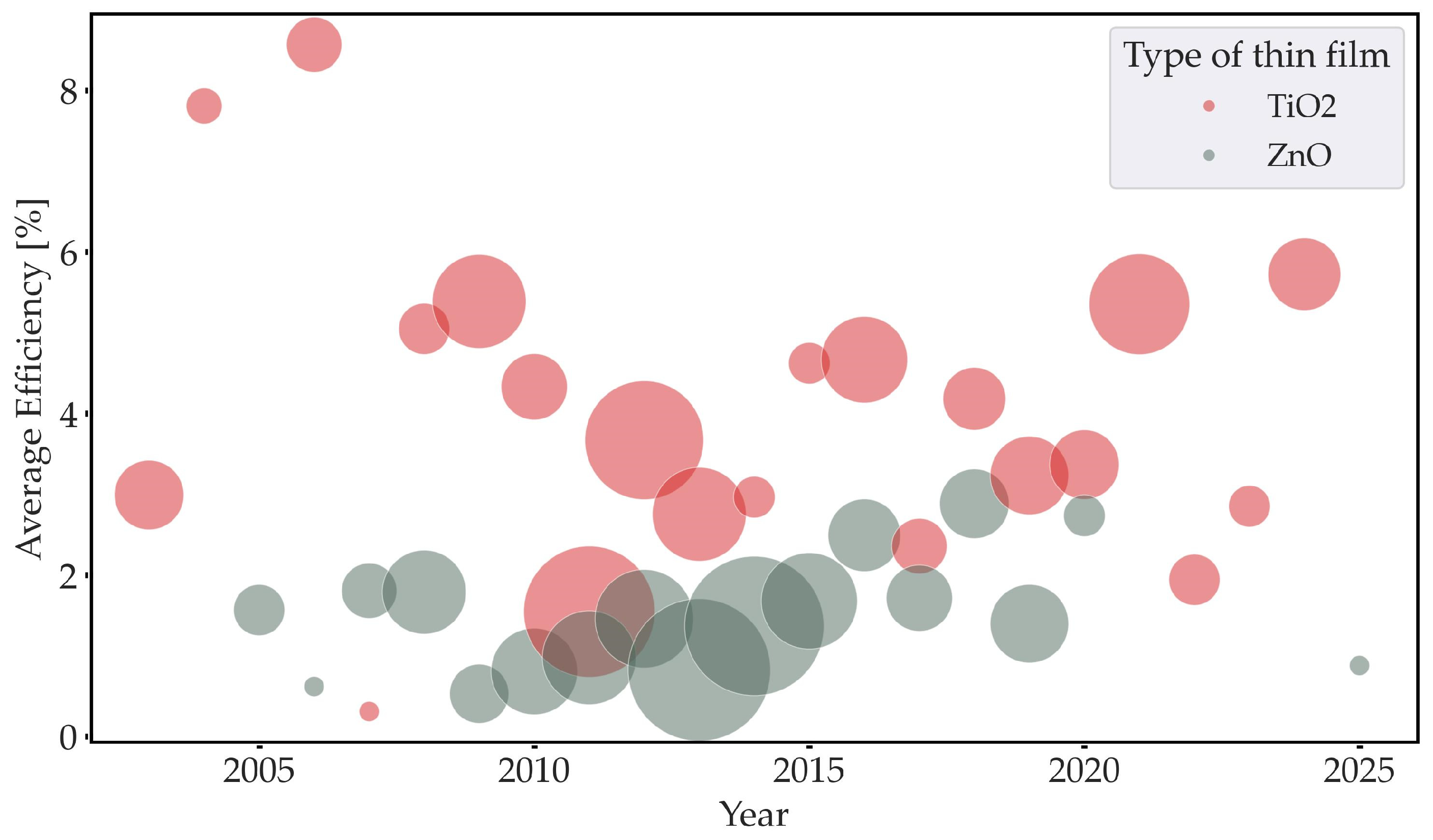 Figure 2 illustrates the average efficiency of DSSCs as a function of years in the form of a bubble plot. The size of each bubble is proportional to the number of publications. In other words, the bubble size corresponds to the volume of the published articles in the field of dye-sensitized solar cells. The horizontal axis shows the years, while the vertical axis represents the average efficiency in percentage. Moreover, based on the figure, it can be observed that TiO