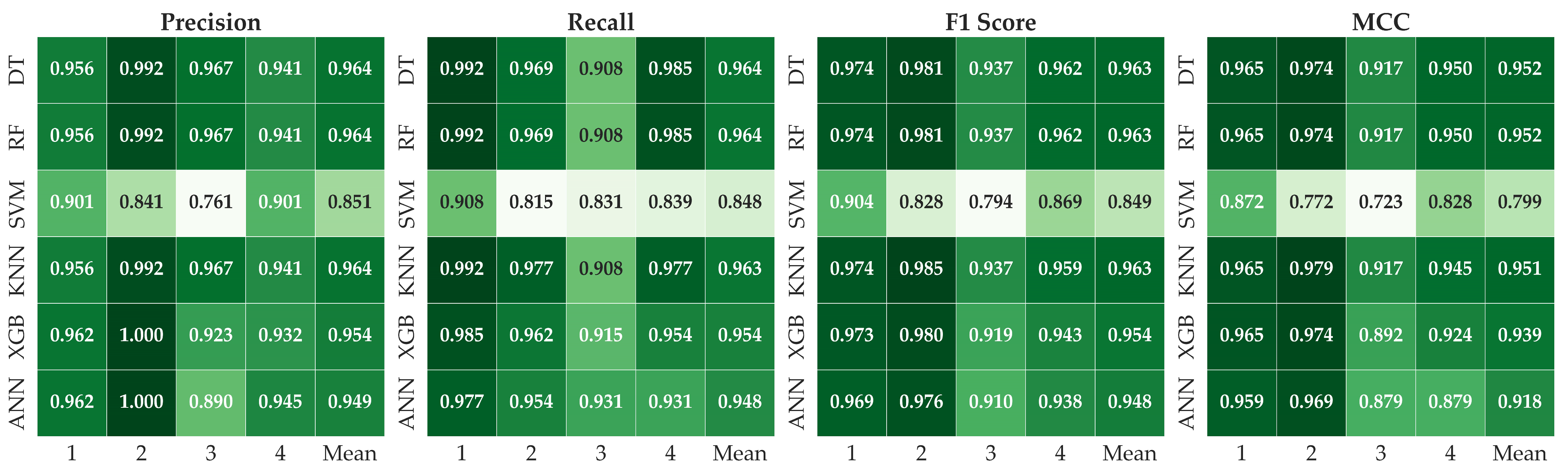 Figure 3, it can be concluded that the DT, RF, and KNN models achieved very similar and high performance across precision, recall, F1 score, and MCC metrics. The differences between the classes are minimal, which is also represented by the deep green coloring on the heatmap. These findings are further supported by the confusion matrix, where DT and RF models provided identical outcomes, and KNN showed only minor deviations. On the other hand, ANN and SVM revealed larger differences. Taking the confusion matrix into account, the prediction accuracy of a model is higher when the off-diagonal entries approach zero or decrease toward zero. In this context,