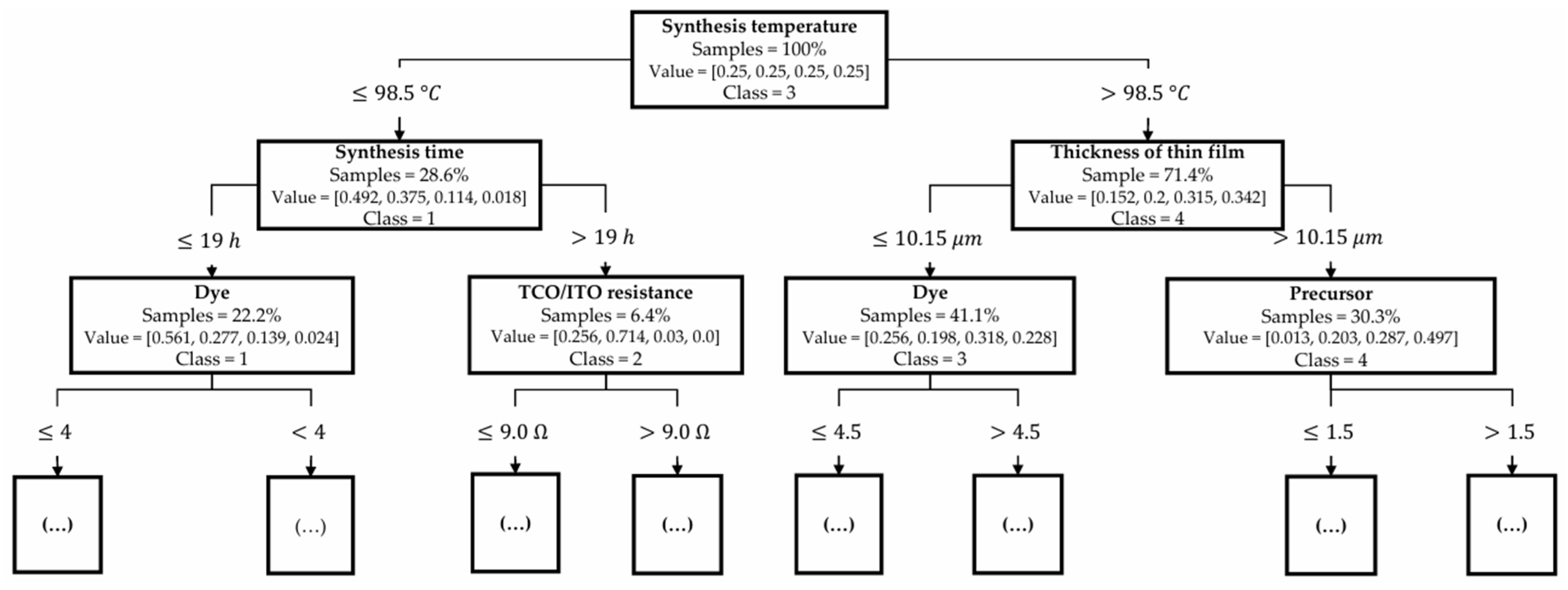 In addition to all this, at the second level, based on the synthesis time, the split occurs at 19 h. If the synthesis time is lower than or equal to 19 h, the dye determines the next split. In contrast, if the synthesis time exceeds 19 h, the next split is determined by the TCO/ITO resistance. Additionally, when the synthesis temperature exceeds 98.5 , the decision process continues with the thickness of the thin film. If the thickness of thin films is lower than or equal to 10.15 , the dye will become the next splitting feature, whereas if the thickness is higher than 10.15 , the precursor drives the split.