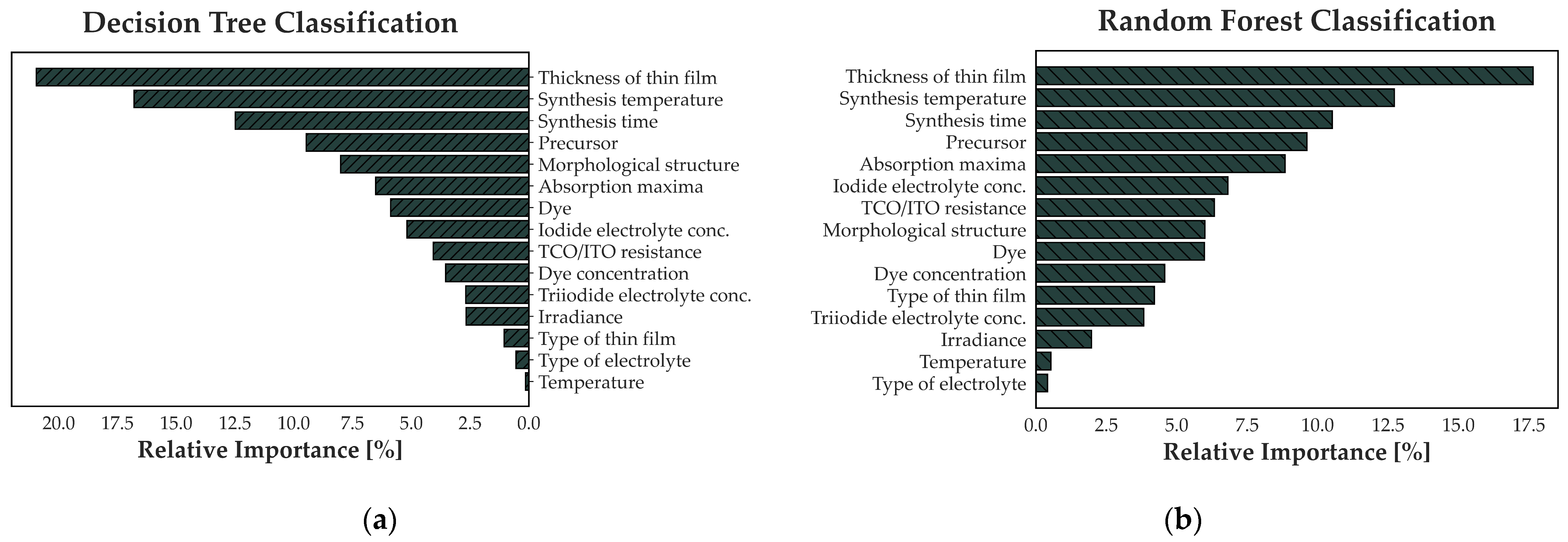 38], it can be concluded that a broader set of input parameters and classification algorithms has been taken into account, leading to a more detailed and complex evaluation. Furthermore, feature importance investigation provided a more in-depth perspective, such as that the thickness of the thin film plays an important role in Decision Tree (20.96%) and Random Forest (17.65%) classification models, emphasizing that the model performance would decrease by more than 17%. In addition, absorption maxima, which is ranked as the sixth (in the case of the DT) and as the fifth (in case of the RF) most important feature, also contributes to the model performance with 8%. Moreover, Li et al. [