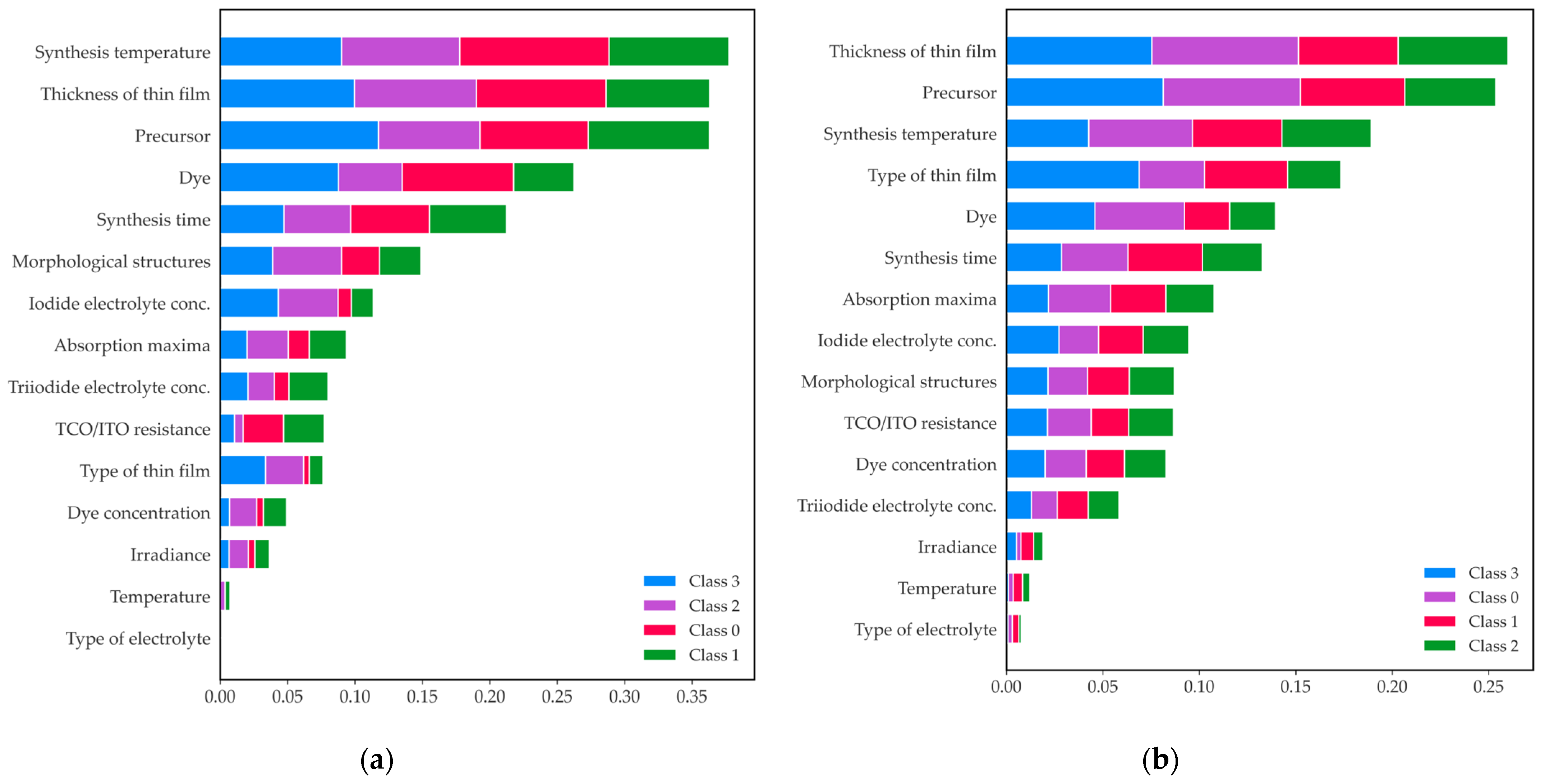For the Decision Tree, the SHAP analysis showed that synthesis temperature was the dominant feature, followed by the thickness of the thin film and precursor. Furthermore, the effect of each class in each of these parameters was consistent, confirming their key role in modeling DSSC performance. The dye feature exhibits higher importance for Class 3 and Class 0. The fifth most important feature is synthesis time, followed by morphological structure. That is, this implies that the process parameter (synthesis temperature), along with the thickness of the thin film, and the precursor, are dominant; the dye is also highly influenceable. Moreover, the morphological structure, the electrolyte concentrations, and the dye’s maximum absorptions, as mid-importance tier, show a moderate importance range. Furthermore, the type of electrolyte concentration and the measurement setting (such as temperature and irradiance) are low, indicating negligible influence.