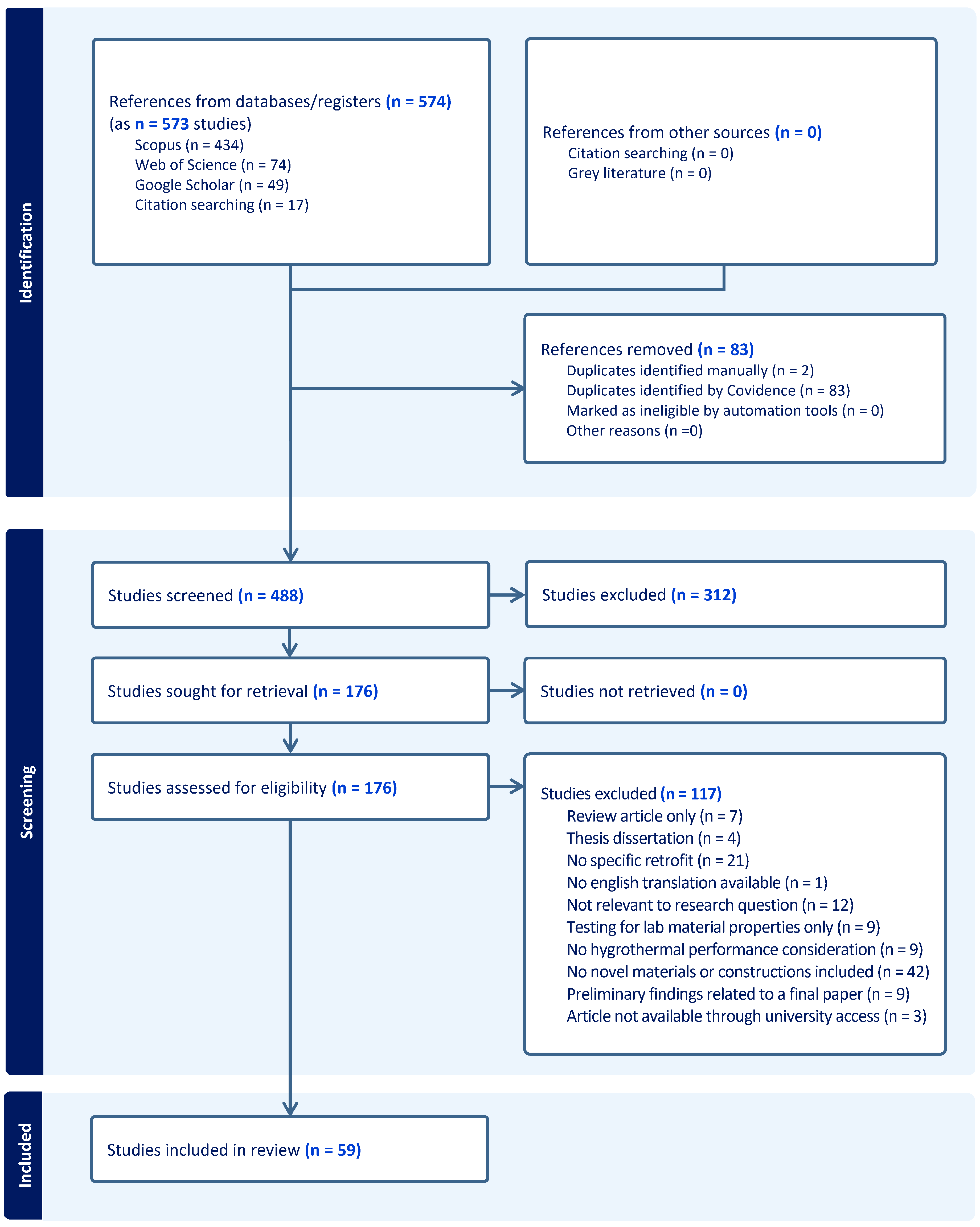 The literature search for this topic was restricted to publications available from January 2013 to March 2025, with a focus on conference and journal articles. Per rapid review methods [15], record searching was limited to a select number of databases with publications in English and with limited searching in gray literature. Studies were found through searching on Scopus, Web of Science, and Google Scholar with terms such as “(novel OR innovative) AND (hygrothermal OR moisture) AND (retrofit OR renovation) AND (model OR simulation OR experiment* OR in*situ) AND (build* OR envelope)”. These searches and further citation searches based on selected papers resulted in 488 articles to screen after duplicates were removed. Database searching began on 18 December 2024, using Scopus and Google Scholar, and Web of Science was used from 6 January 2025. Citation searching was ongoing between the start of the review (December 2024) and the end of the review, with the last database search conducted on Google Scholar on 24 February 2025, and Web of Science and Scopus on 2 April 2025.