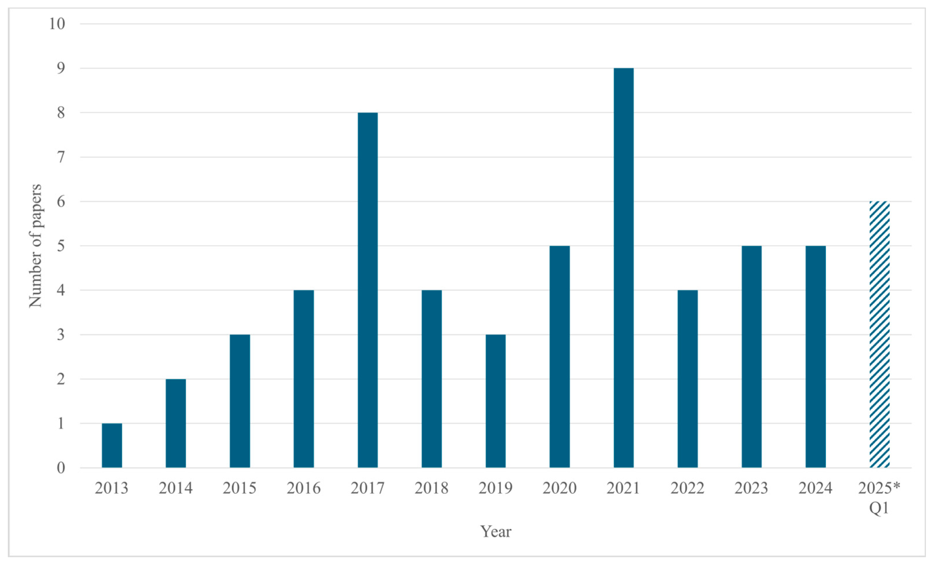 There were 59 publications selected for further analysis including journal and conference papers. These were published between 2013 and 2025, with publication year frequency given in Figure 2 below. Note that the number of papers selected from 2025 reflect only those selected in the first quarter of 2025 (*Q1): from January to March 2025.